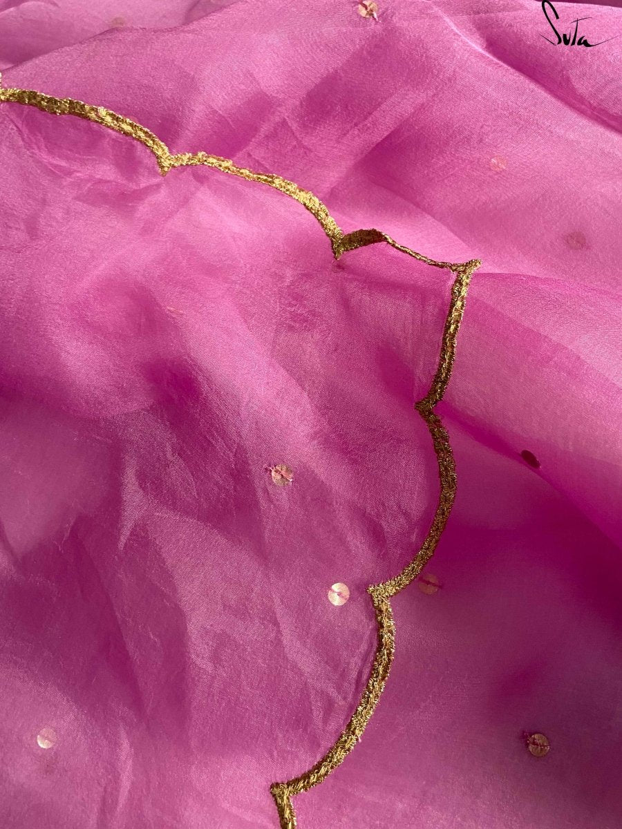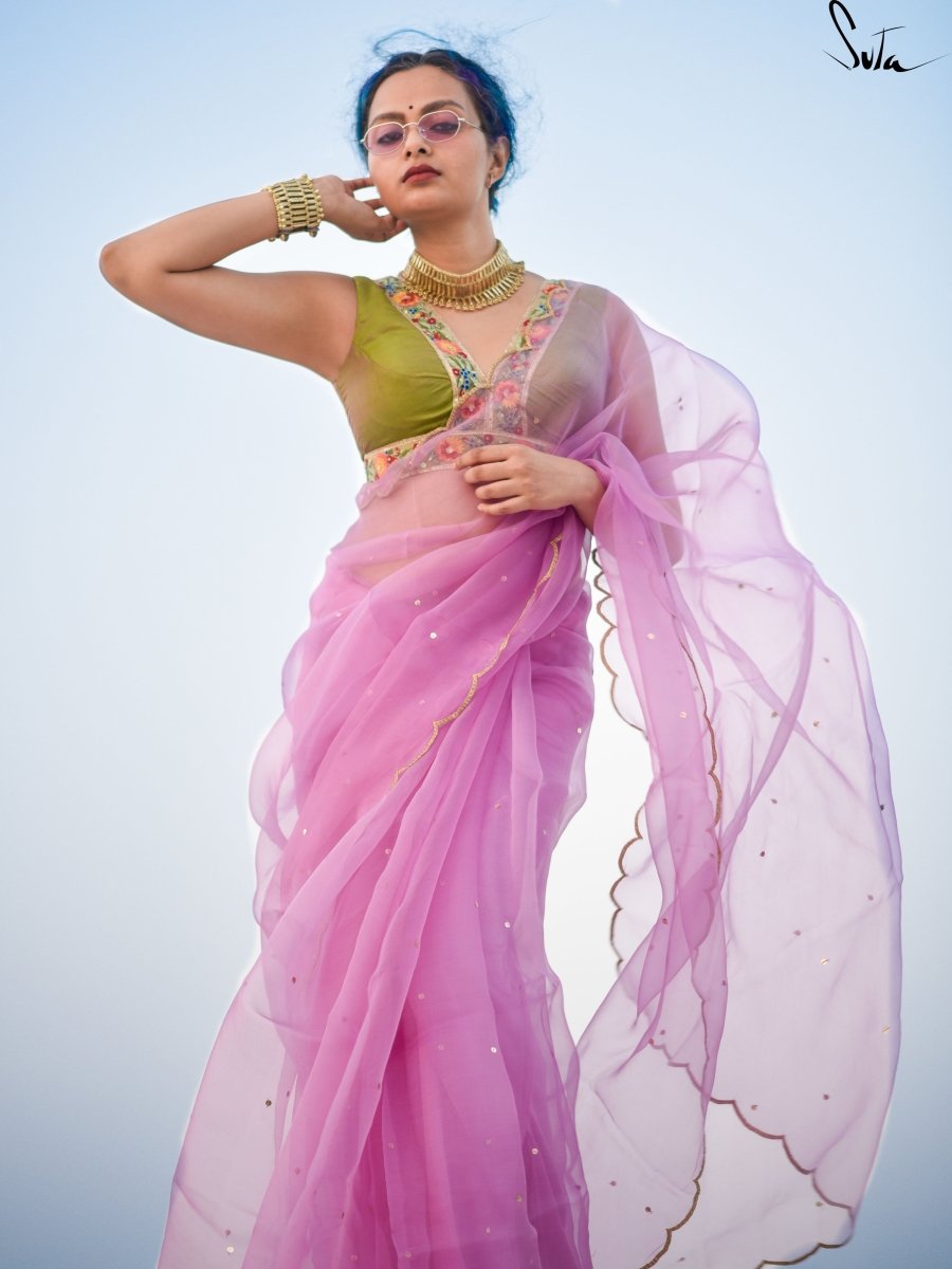 This lilac organza silk saree celebrates the arrival of spring with its sheer beauty and the embroidered scallops and hand-stitched chumkis perform a celebratory dance!