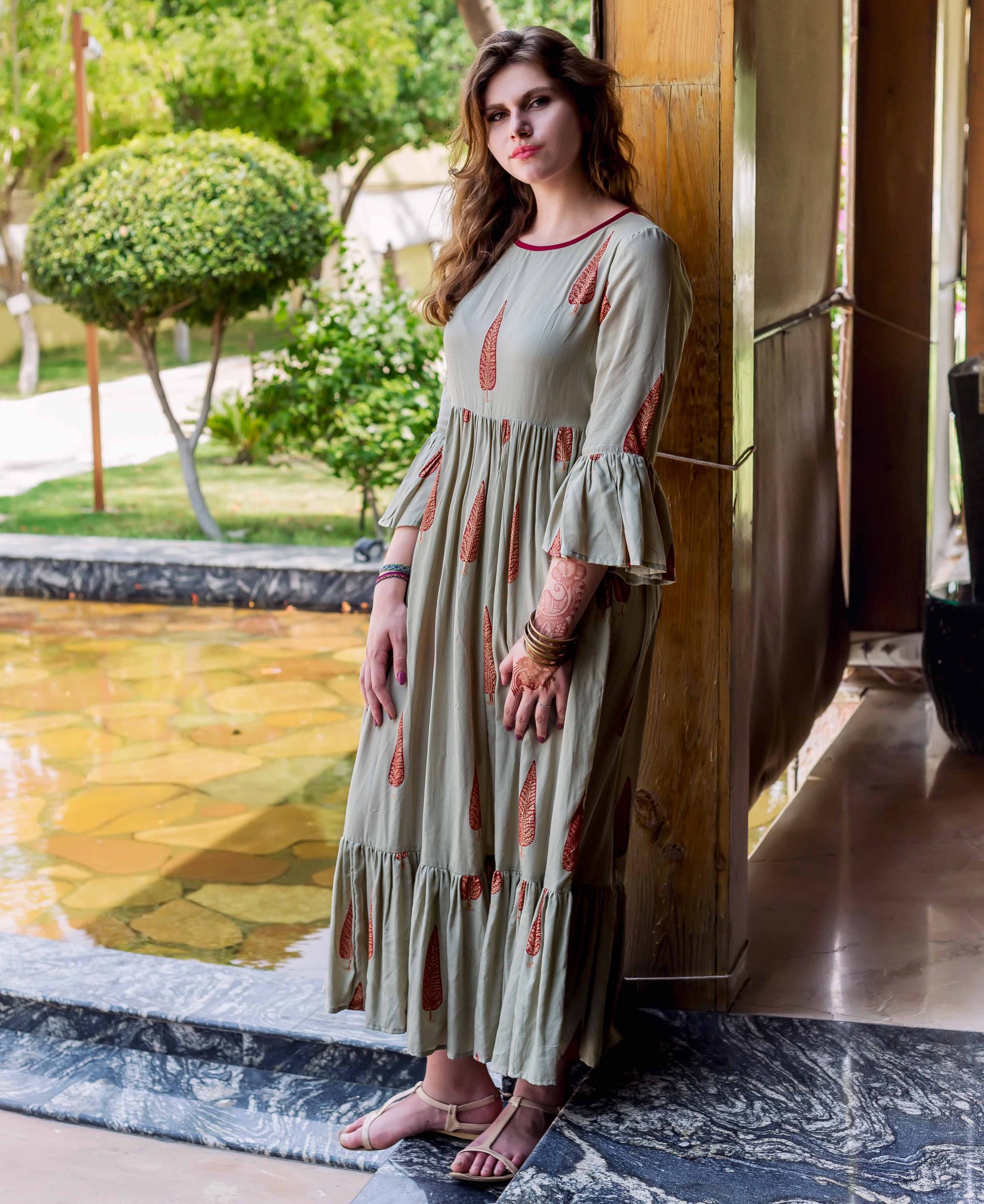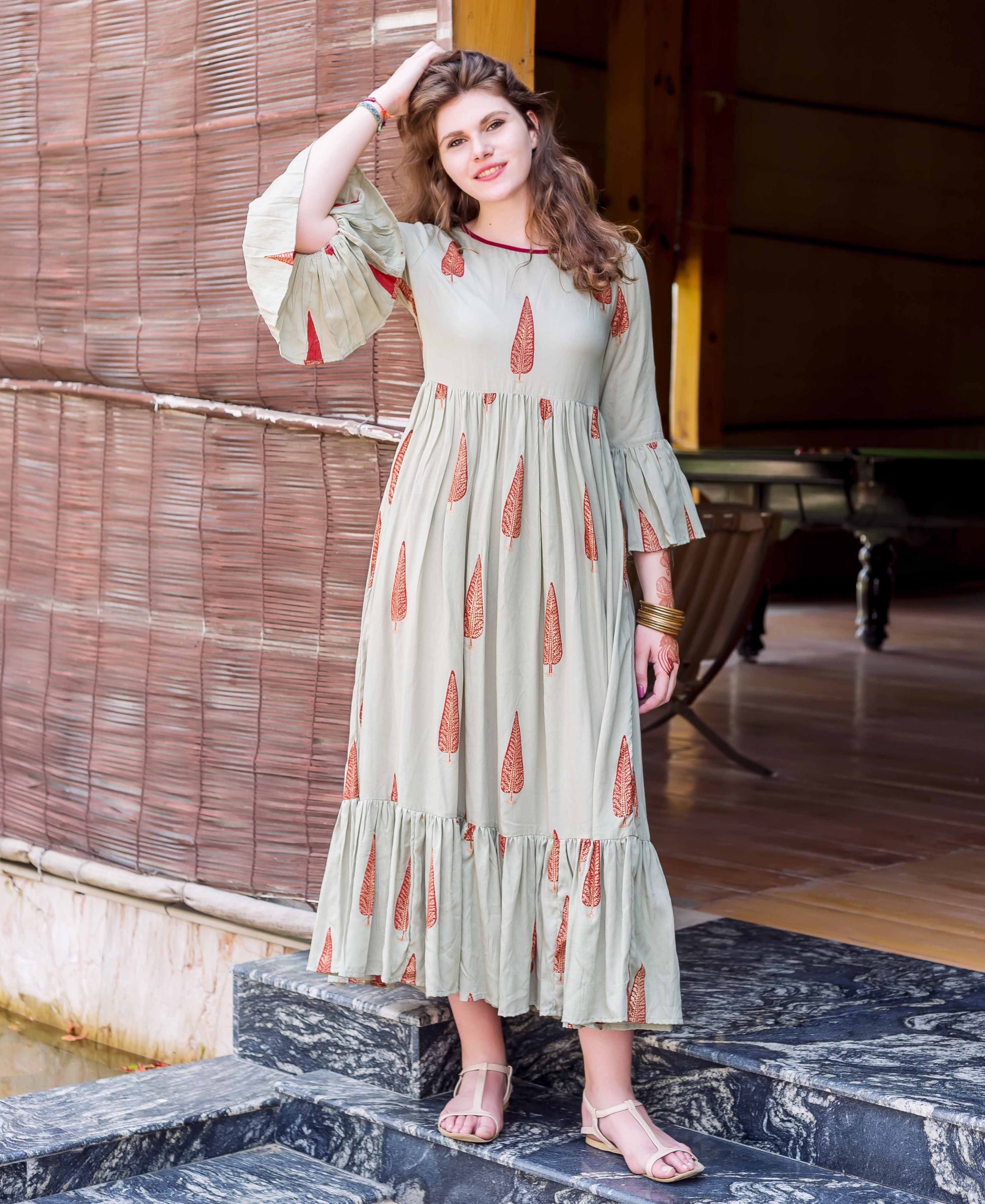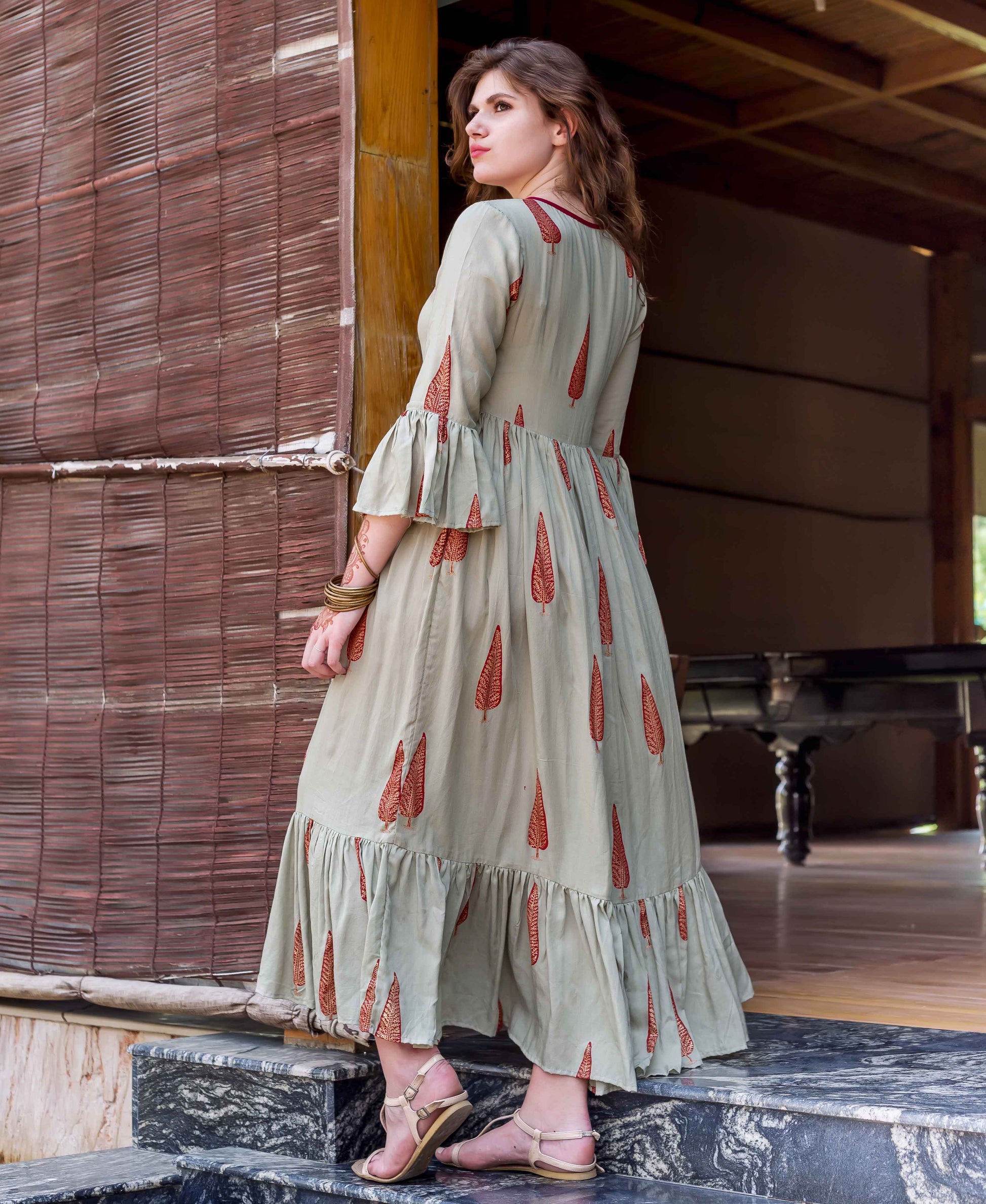 - Long Dress with Frill at Bottom & Sleeve Bottom
