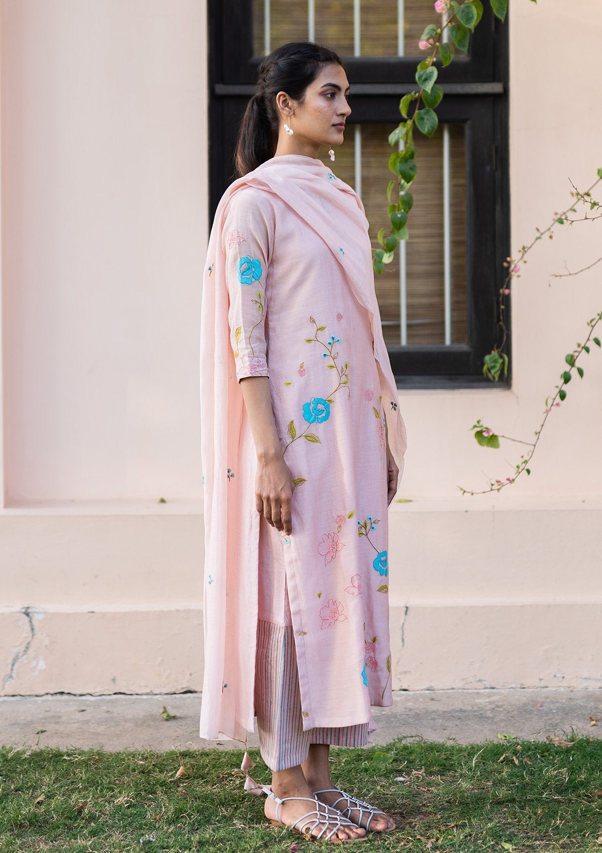 The straight fit salmon kurta features contrasting floral applique. The kurta is paired with an embroidered dupatta and striped pants.