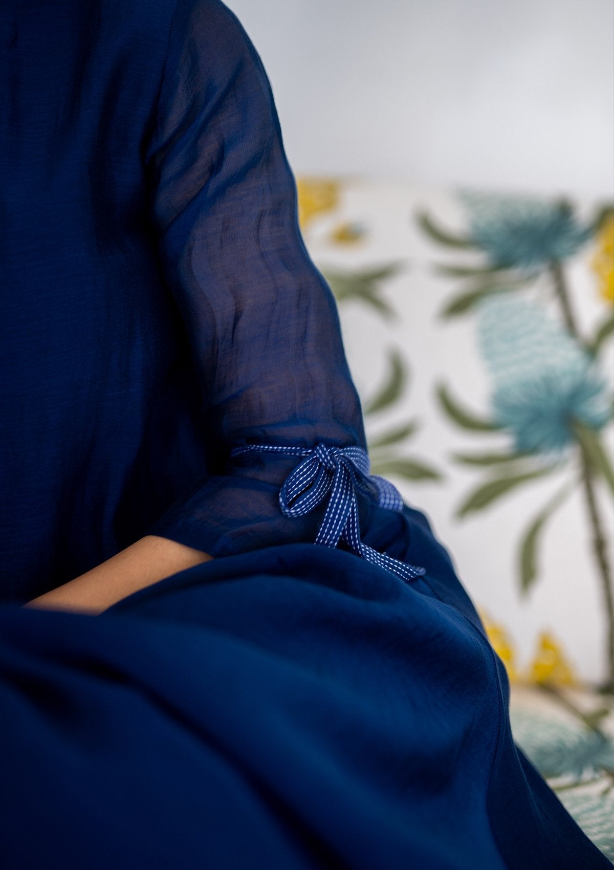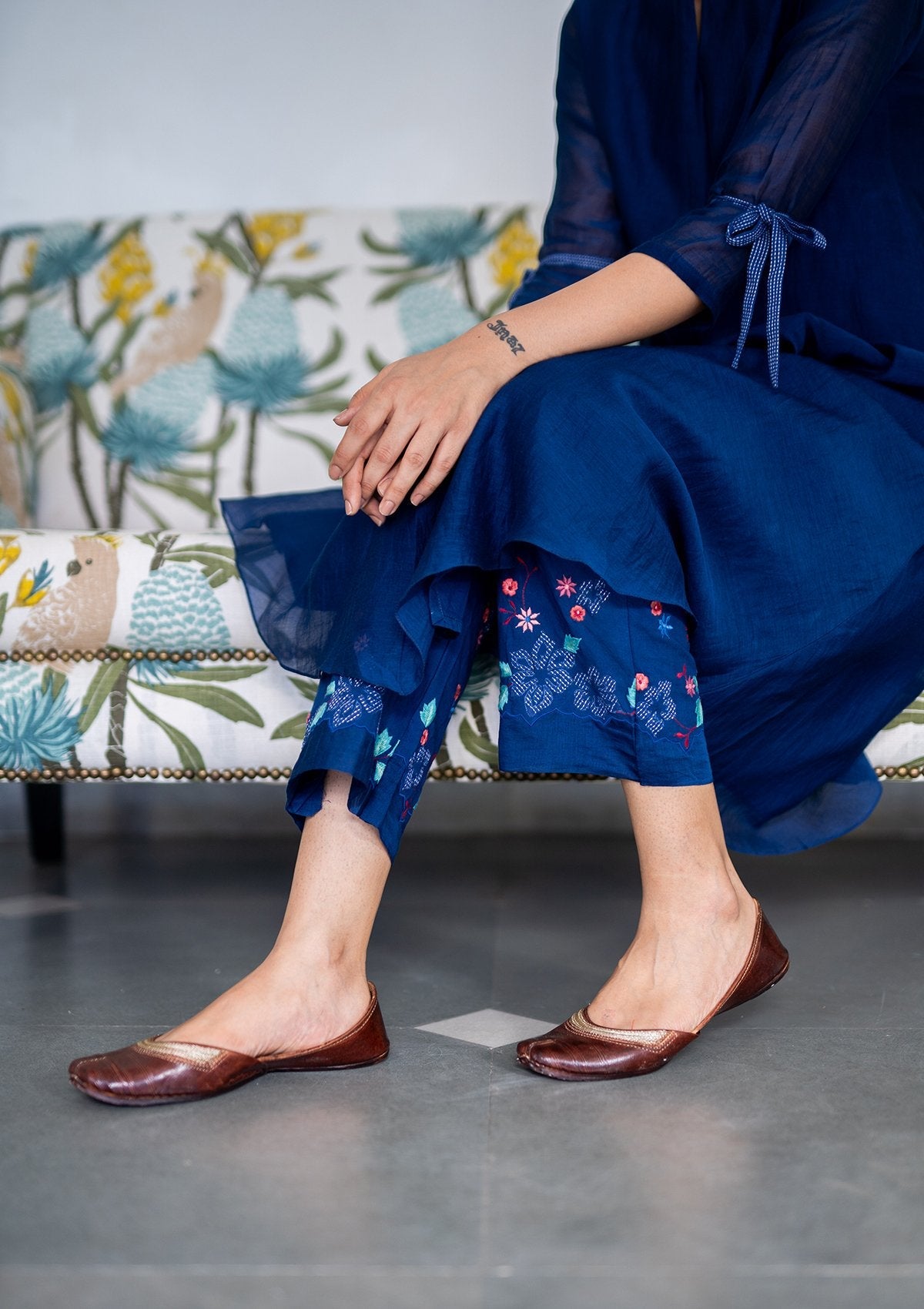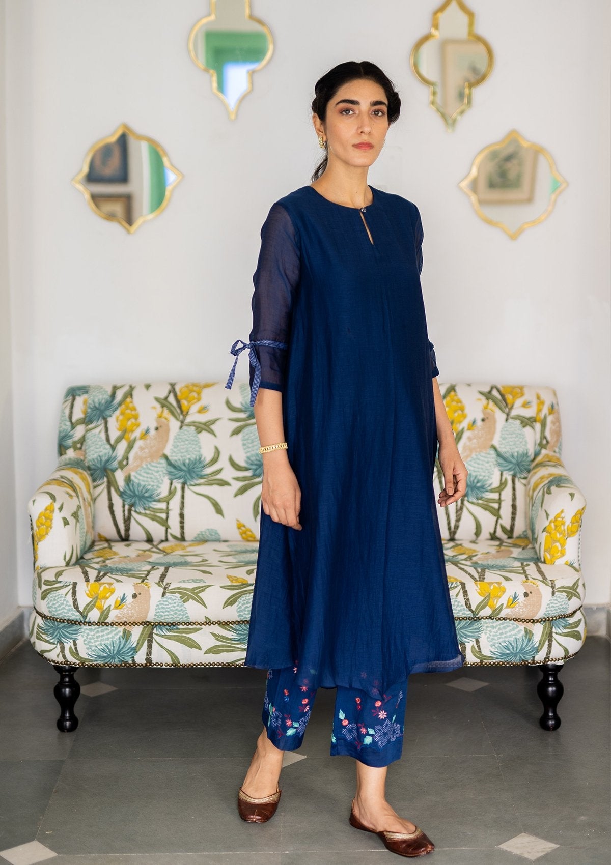 The classic sapphire kurta features tie details along the sleeve. The kurta is paired with applique and applique floral embroidery pants.
