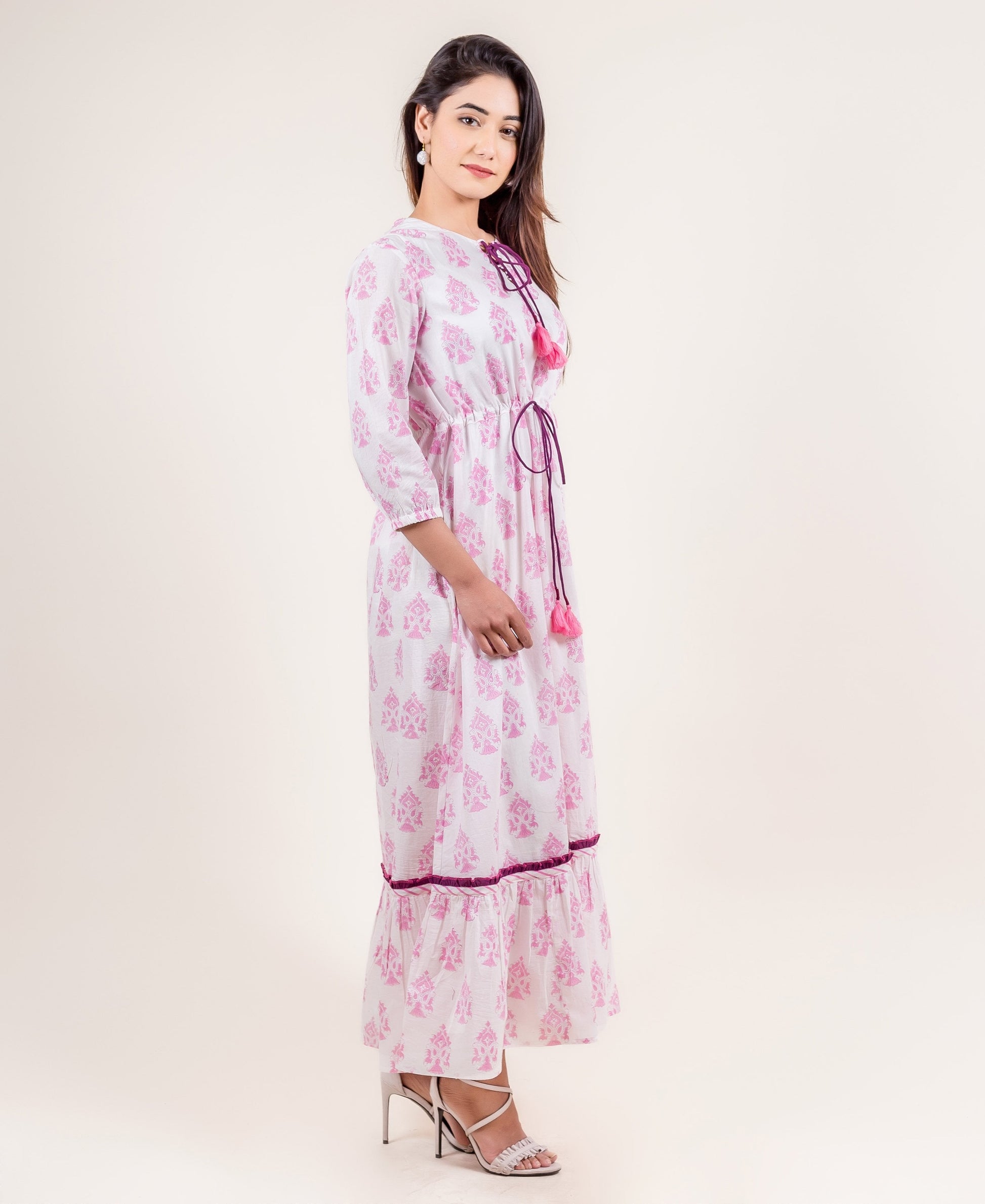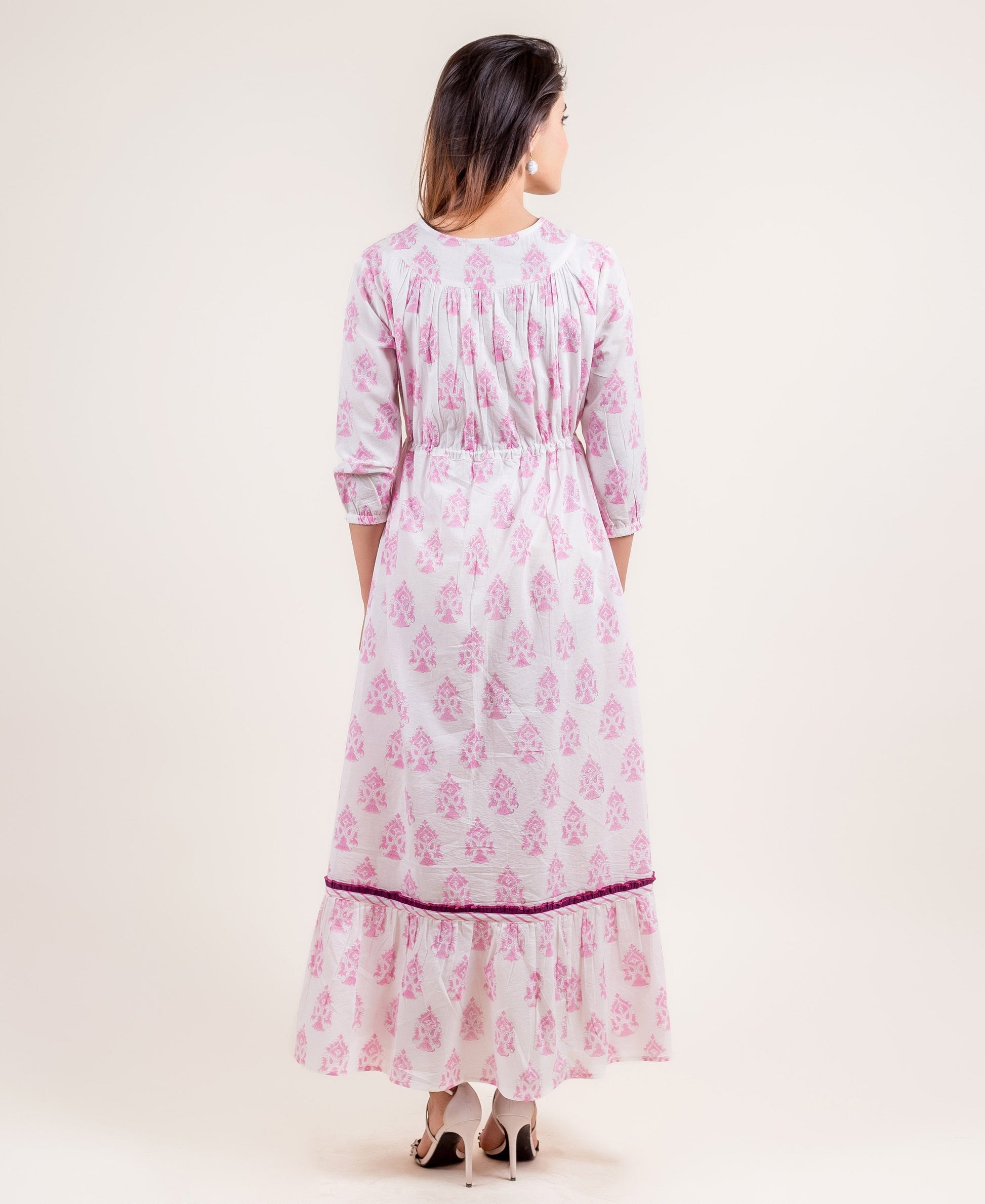 Make all the heads turn towards you when you dress up in this stylish and sassy tiered hand block printed long dress from the house of . Fabricated from pure cotton, this beautiful dress gives you a chic and gorgeous look with its white, pink and lilac hues. With front open slit neck and quarter sleeves, the charm of this dress is something that you won’t be able to resist.