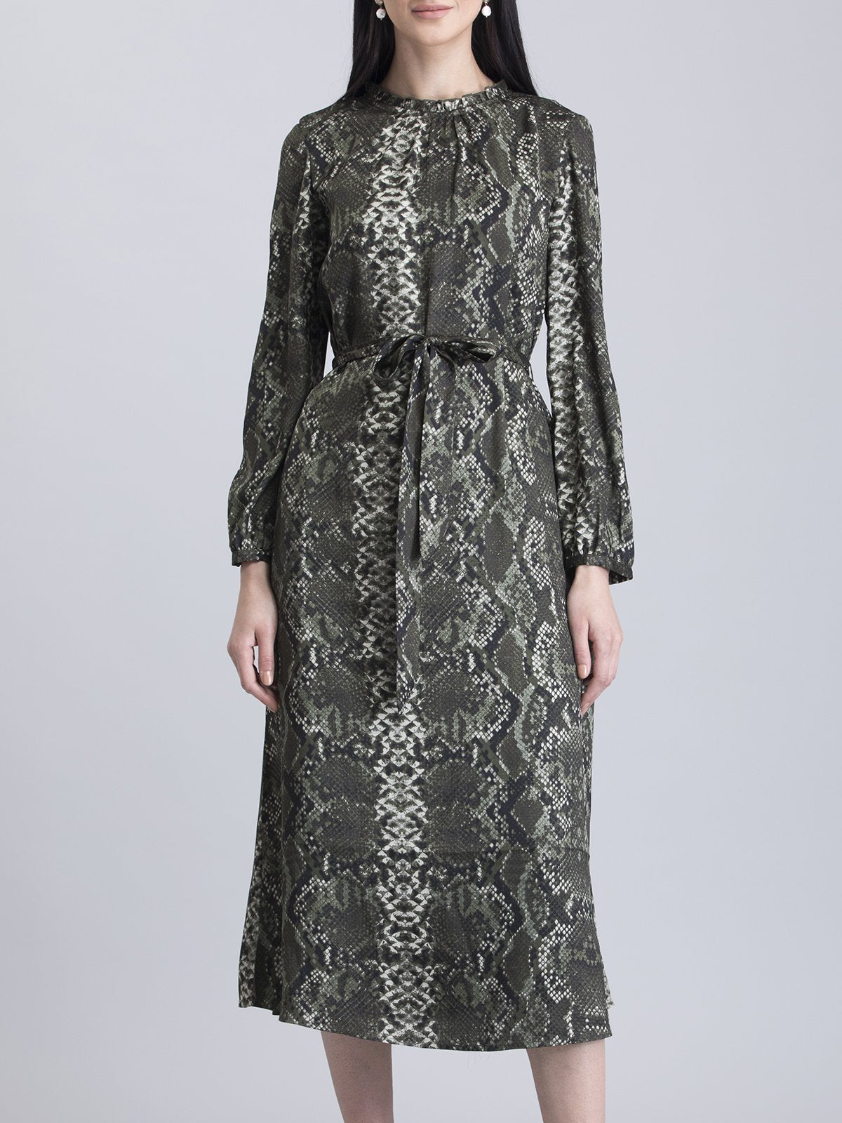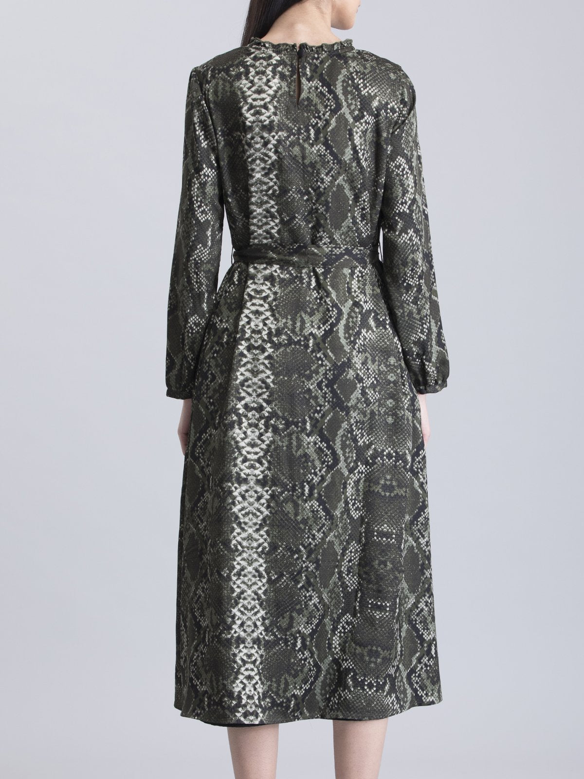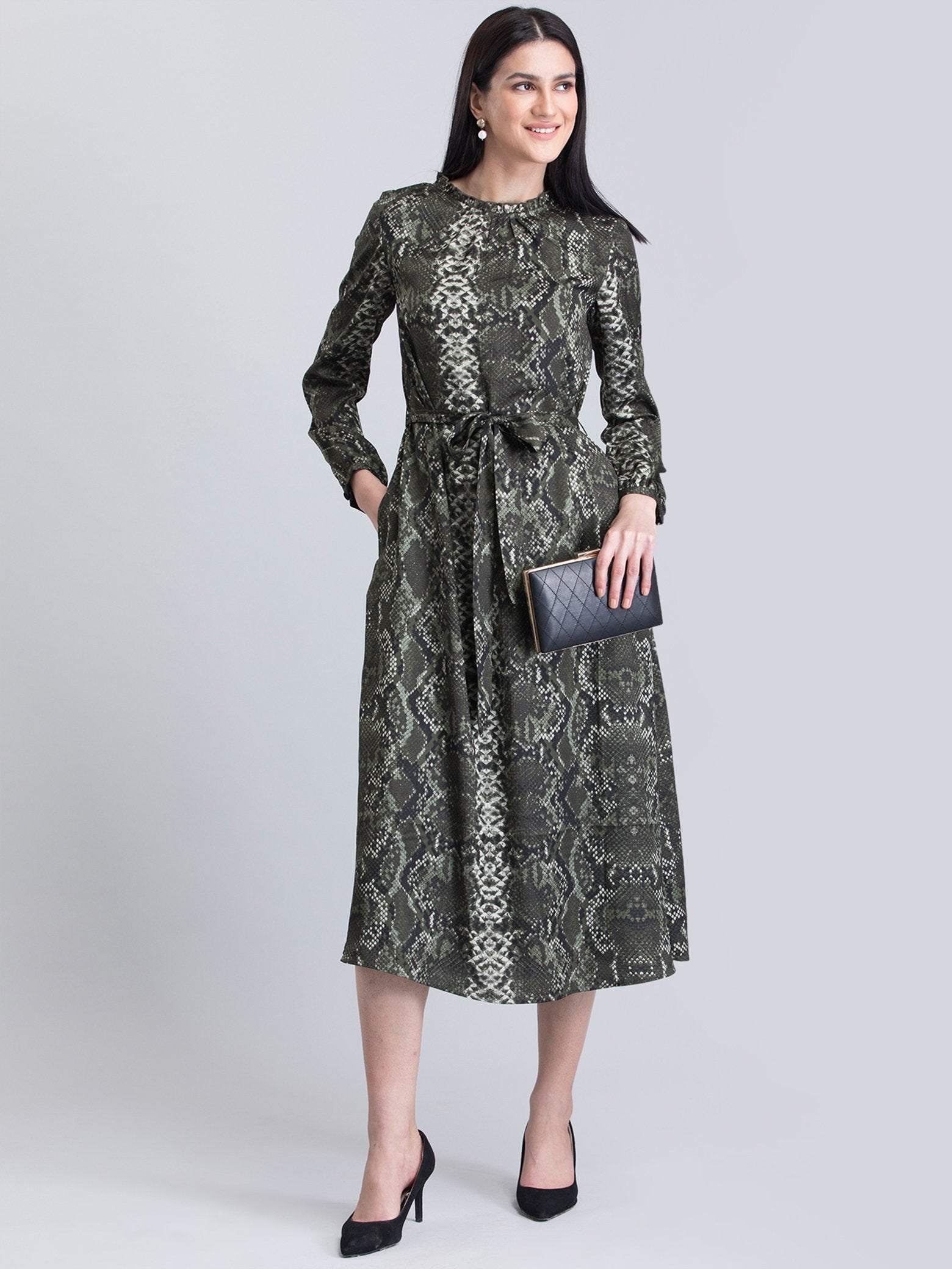 This green and black, midi, A-line dress has animal print, Mandarin collar, ruffle detail, full sleeves, belt, button for closure and Polyester lining. Made from Satin, it is delicate, luxurious and has a shimmer & natural feel.