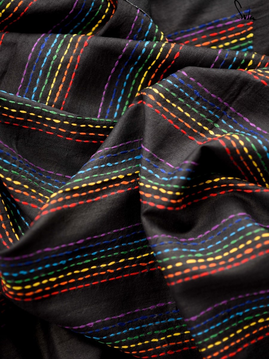This black Tussar silk saree with kantha work in rainbow colours is pure love!