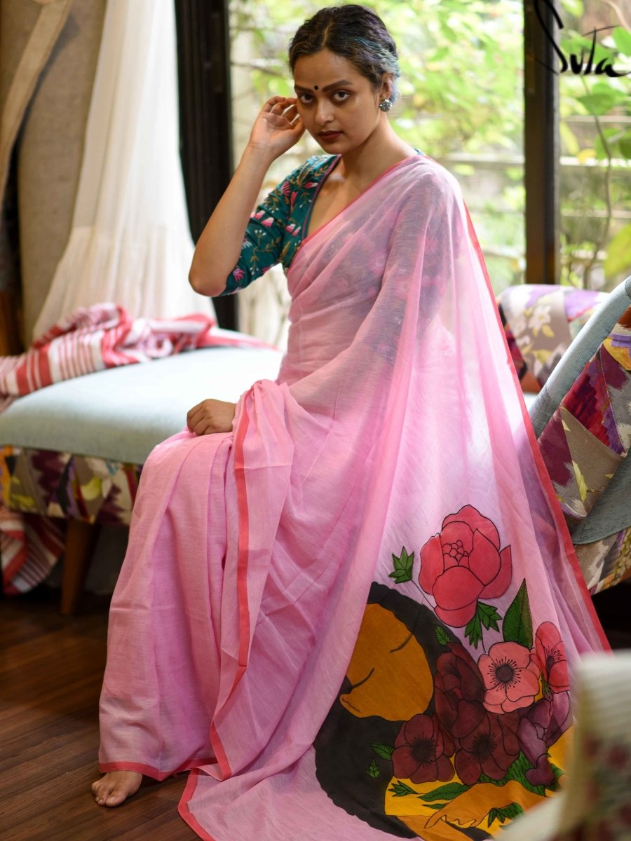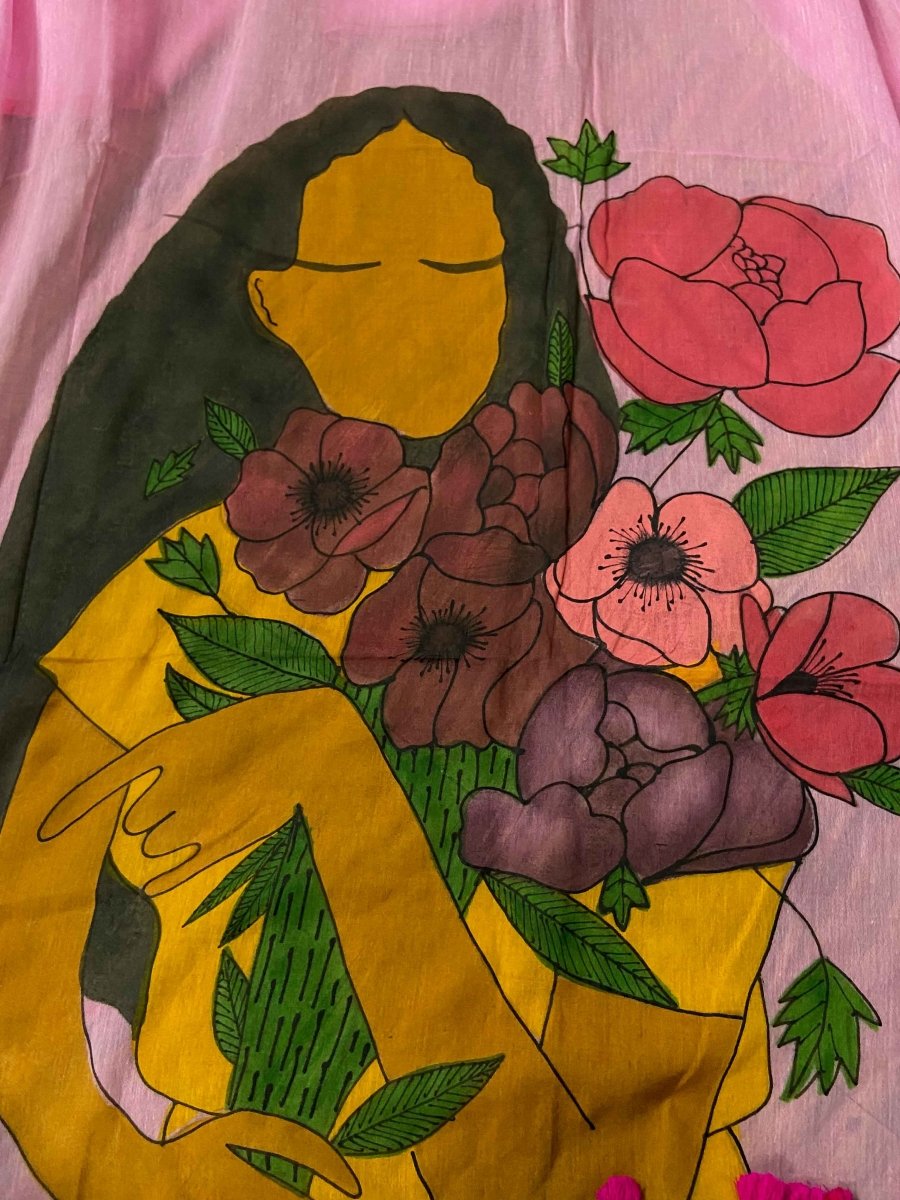 Our artists paint with all their hearts to create the hand-painted sarees. First, the painting is created with a pencil and watercolors and once it is finalised, it is made on a live-sized paper and sent to artisans in villages. These artisans keep this as a reference and paint the final painting on the fabric in a free-hand technique. The softest Mul fabric becomes the perfect canvas for this art and these sarees make a statement like no other. There are bound to be some irregularities here and there and no two products will look absolutely the same. This is the beautiful allure of hand-painted art.