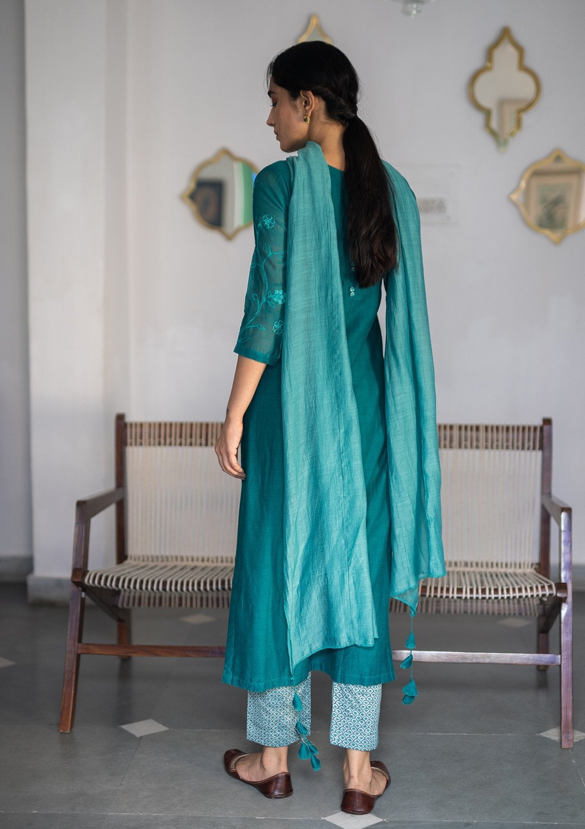 The rich jade kurta features a details of floral aari embroidery. The kurta is paired with a matching dupatta and a printed chanderi farshi.