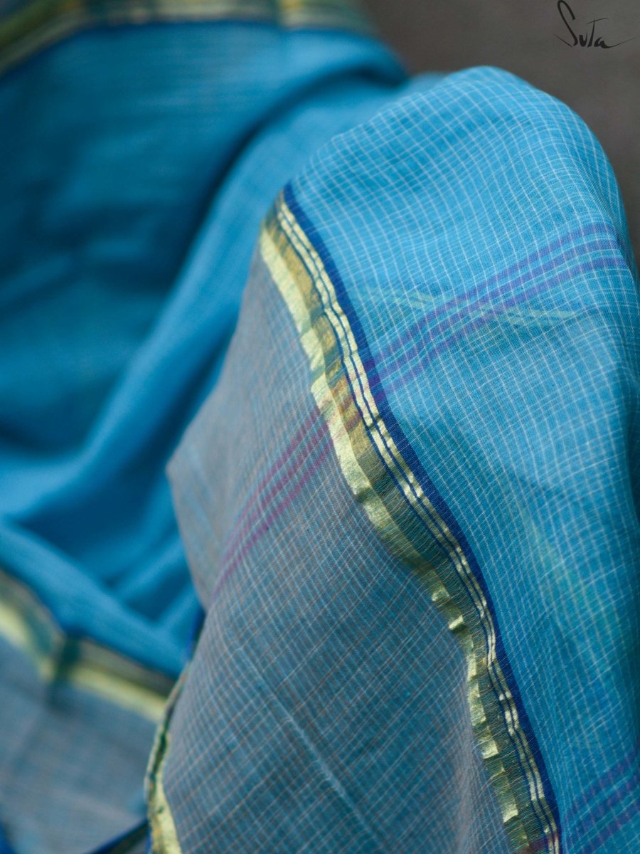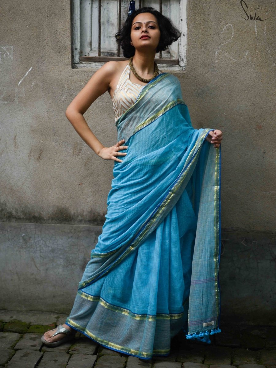 She had the perfect balance of elements within her. Her sunny personality shone through with ease while her dark and twisted thoughts poured out when she allowed it. She could make sense of the most eccentric as well as the most normal person with ease, for she was both of it. She could not define herself with one word but she was unmistakable. She was a golden sun in the blue sky for sure! This brilliantly pretty cotton saree in adorable light blue with touches of gold is simply beautiful. Drape this charmer on!