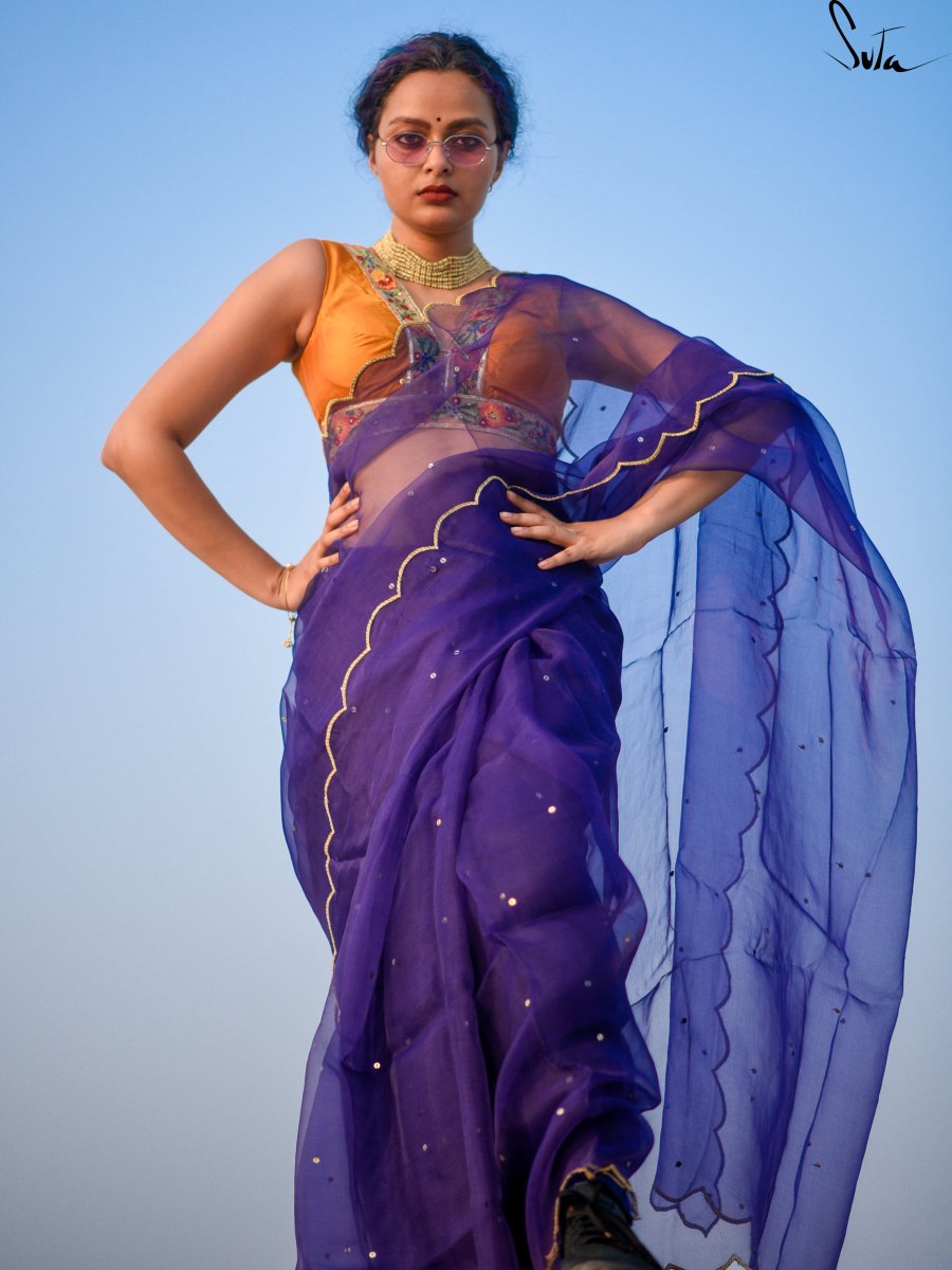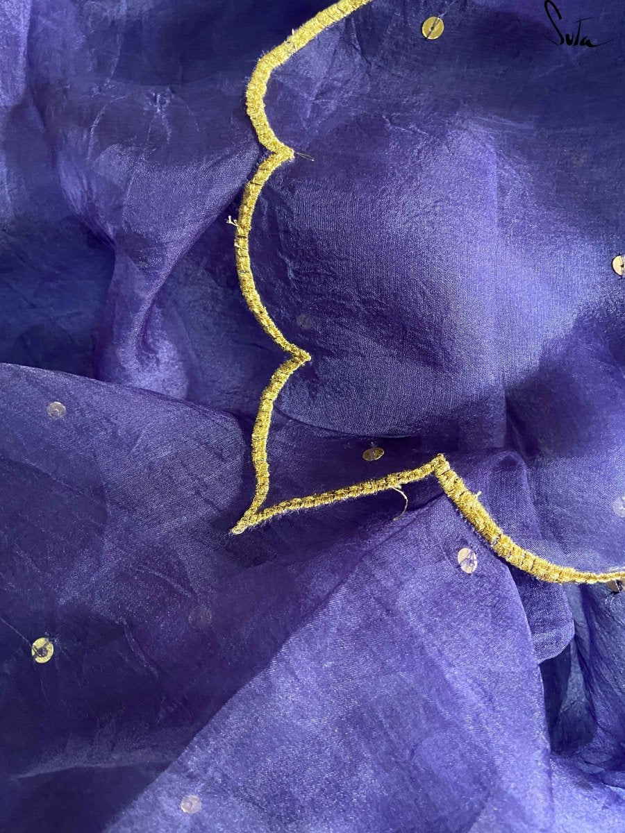 This dark blue organza silk saree with embroidered scallops reflects the fleeting depths of the evening sky with a generous sprinkling of stars brought by the hand-stitched chumkis!