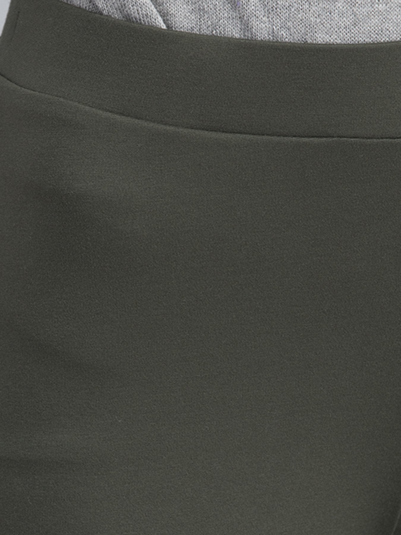 These olive, slip-on, bootcut, knitted jeggings are mid-rise, slim fit and have pockets. Made from Polyester Knit, these are stretchable, comfortable and anti-wrinkle.