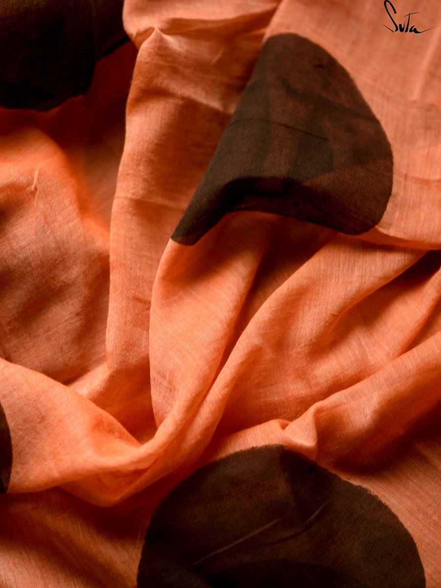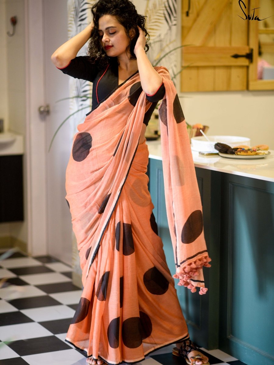 This orange and black made-in-heaven mul saree with screen-printed polka dots is all heart!