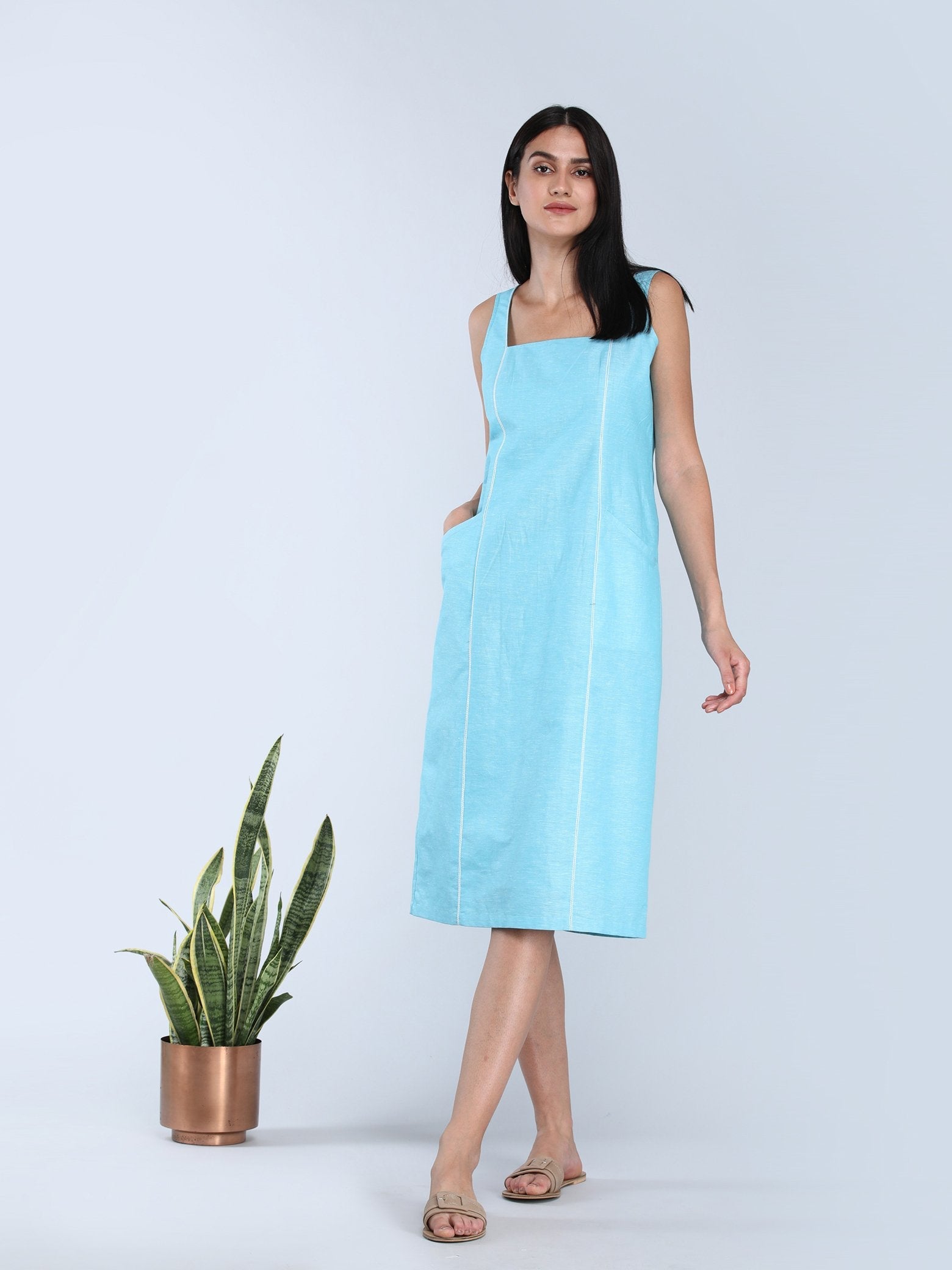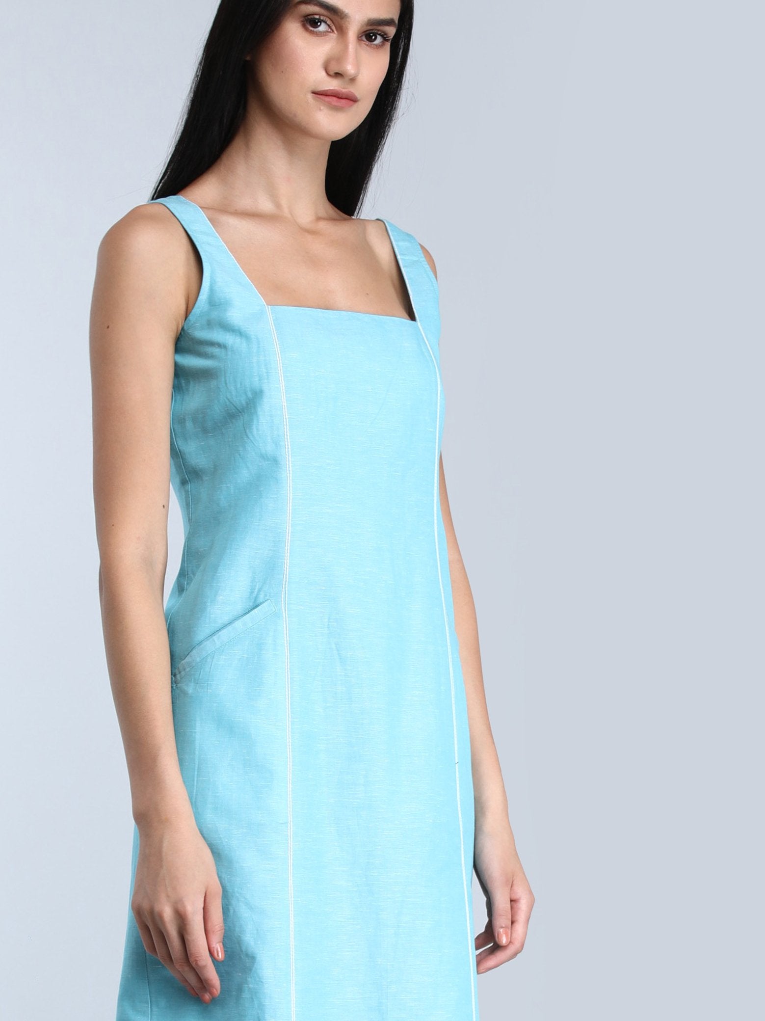 Lounge around the house or step out for essentials in this pretty, blue, shift dress. It is sleeveless with a square neck, white detail on the front and functional pockets. A Cotton-Linen blend, it is luxurious, breathable and comfortable.