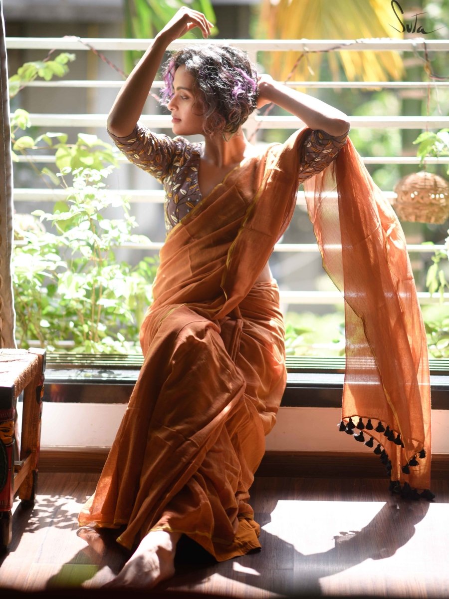This brown and gold made-in-heaven mul saree will make you shine like the brightest damn star!