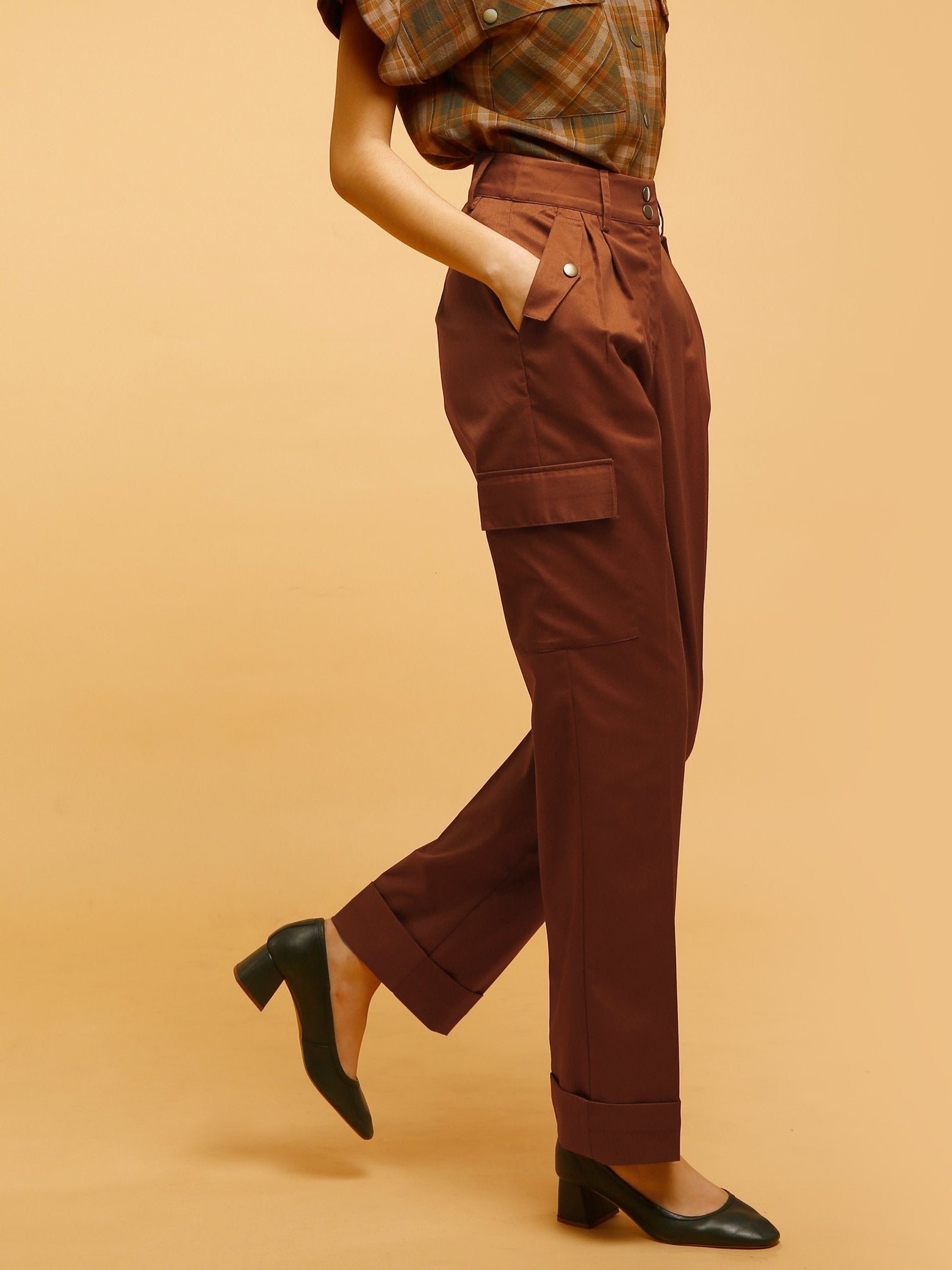 Walk the talk in these rust, straight fit pants. These feature delicate creases, buttons and zip for closure, loops for belt, functional pockets with button details and folded hem. A Polyester-Viscose blend, these are lightweight, durable, soft, anti-pill, have a nice finish and fall and wrinkle lightly.