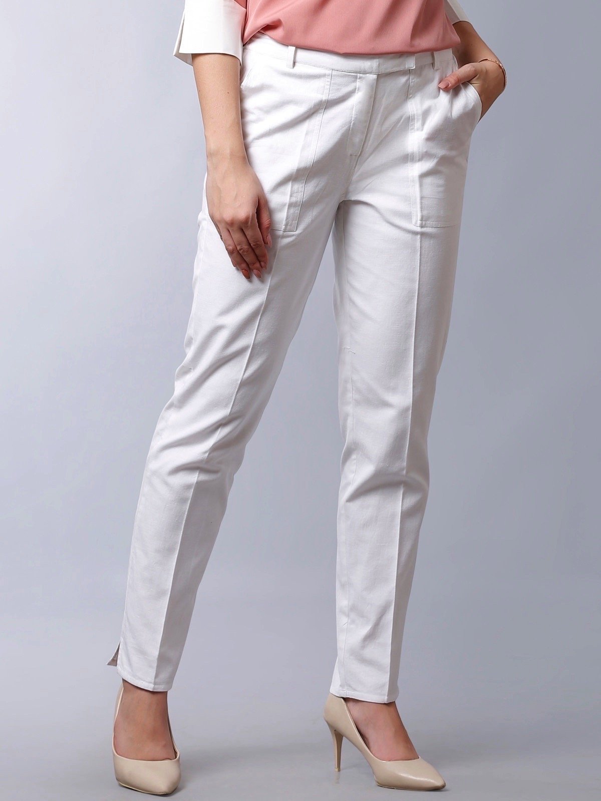 Get classic style and comfort with these white, straight fit trousers with functional pockets, hook with zip fly for closure, elastic at the back and loops for a belt. These also have slits on the hem. Made from Cotton Flax, these are comfortable, breathable and have a structured property to them.