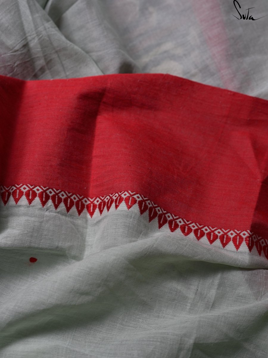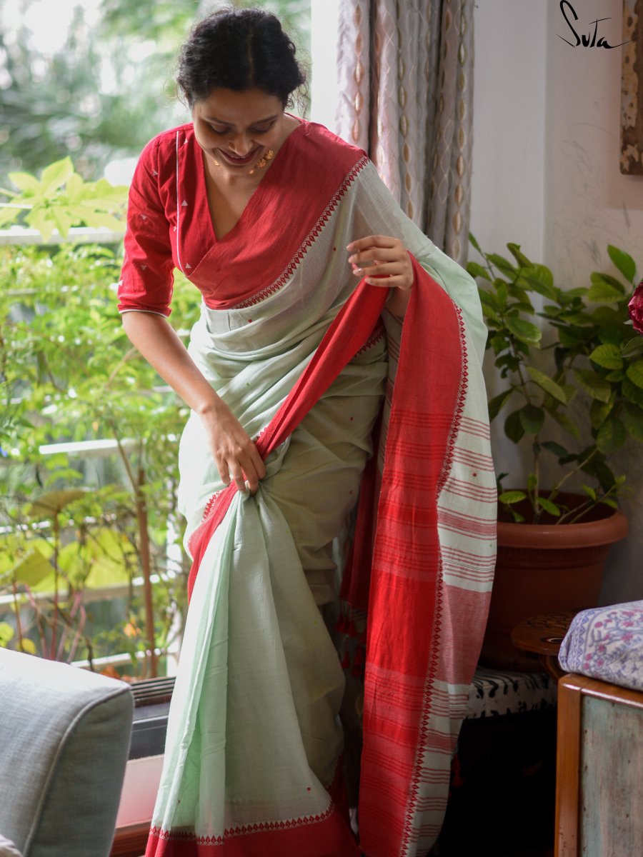 She was a woman of few words, always in control. She had no qualms being out of the spotlight, she gave way for others instead of getting into the rat race. She was secure enough to say ‘enough’ and enjoy the peace of chasing nothing but butterflies. She was polite even when provoked and nice even when no one noticed. She lived a life of meaning and was one of the lucky ones who had experienced the beauty of just being. This handloom cotton saree in green and red is earthy, gorgeous and a saree to cherish!