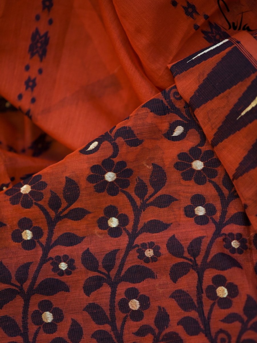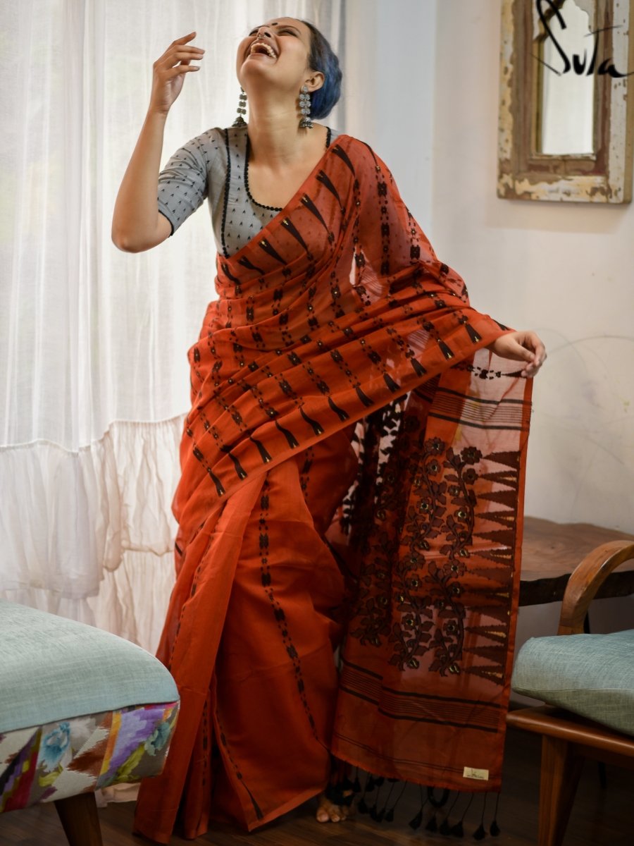 This saree is made of a gorgeous fabric that is a blend of cotton and polyester, hand-woven on a Jacquard handloom. Here, a set of punch-cards are attached to handlooms to sort the weaving patterns. This makes it easier and faster for weavers to weave the fabric to life. The saree is fluid, soft, falls amazingly well and embodies the charms of handloom fabrics.
