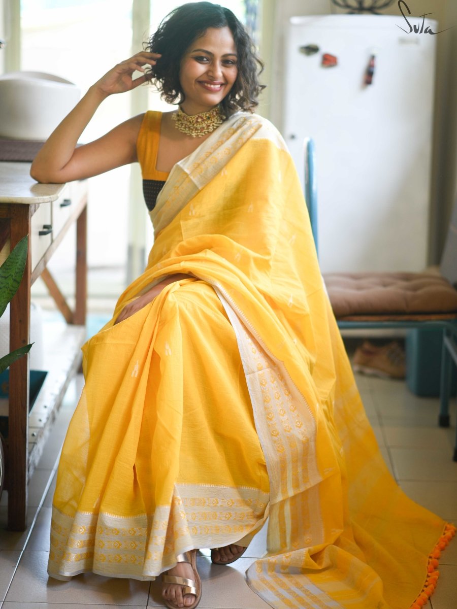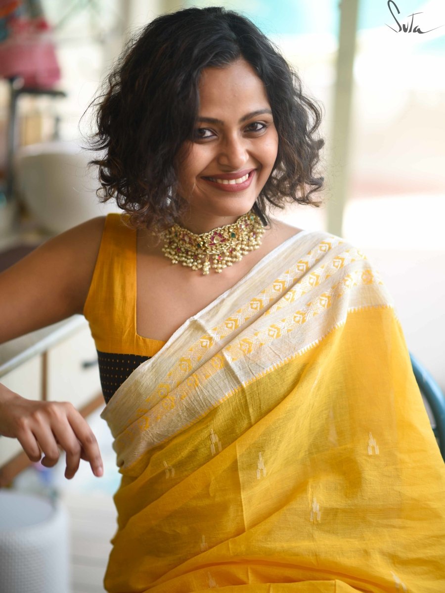 This yellow and white handloom cotton saree is dreamy summer scenery by itself. Don’t miss it!