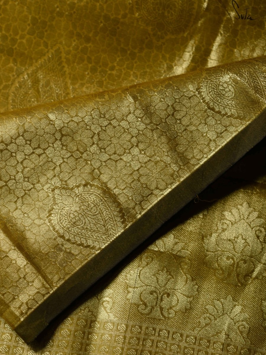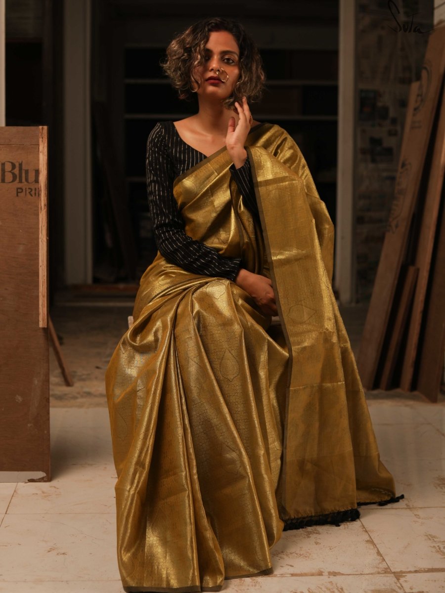 The golden lights on the banks of Ganga are lights that spread the warmth of universal love. The surreal sights of the Ganga aarti are impossible to beat. It is the most holy, sacred experience that goes beyond religions and regions. Thousands of people offer their prayers to the life-giving Ganga mata as the men with shimmering silk dhotis perform the aarti with vigour. It feels like the rest of the world comes to a standstill to watch this magic! This golden saree is an expression of our love to this golden hue.