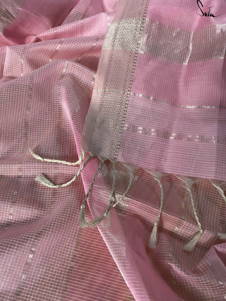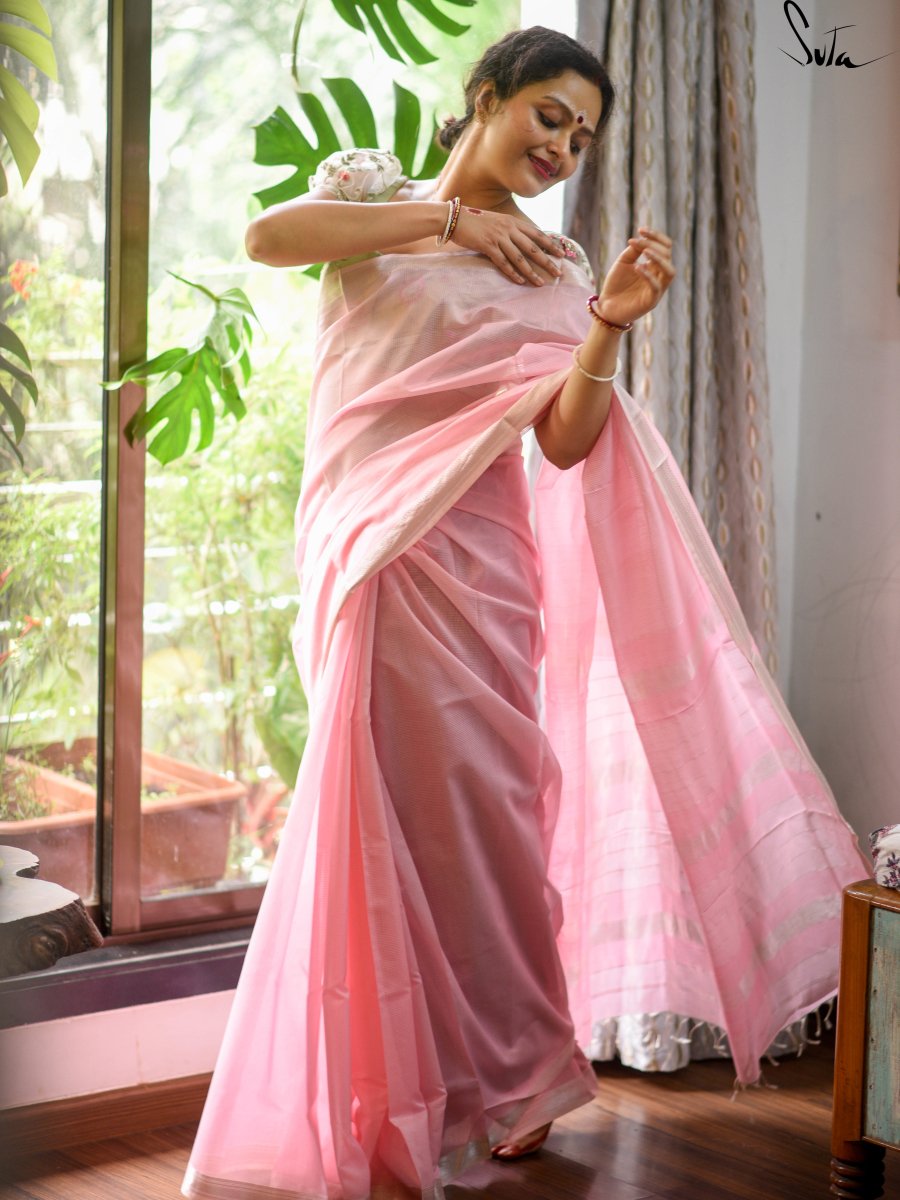 This delicate pink drape in handloom silk cotton with zari border is a dream!