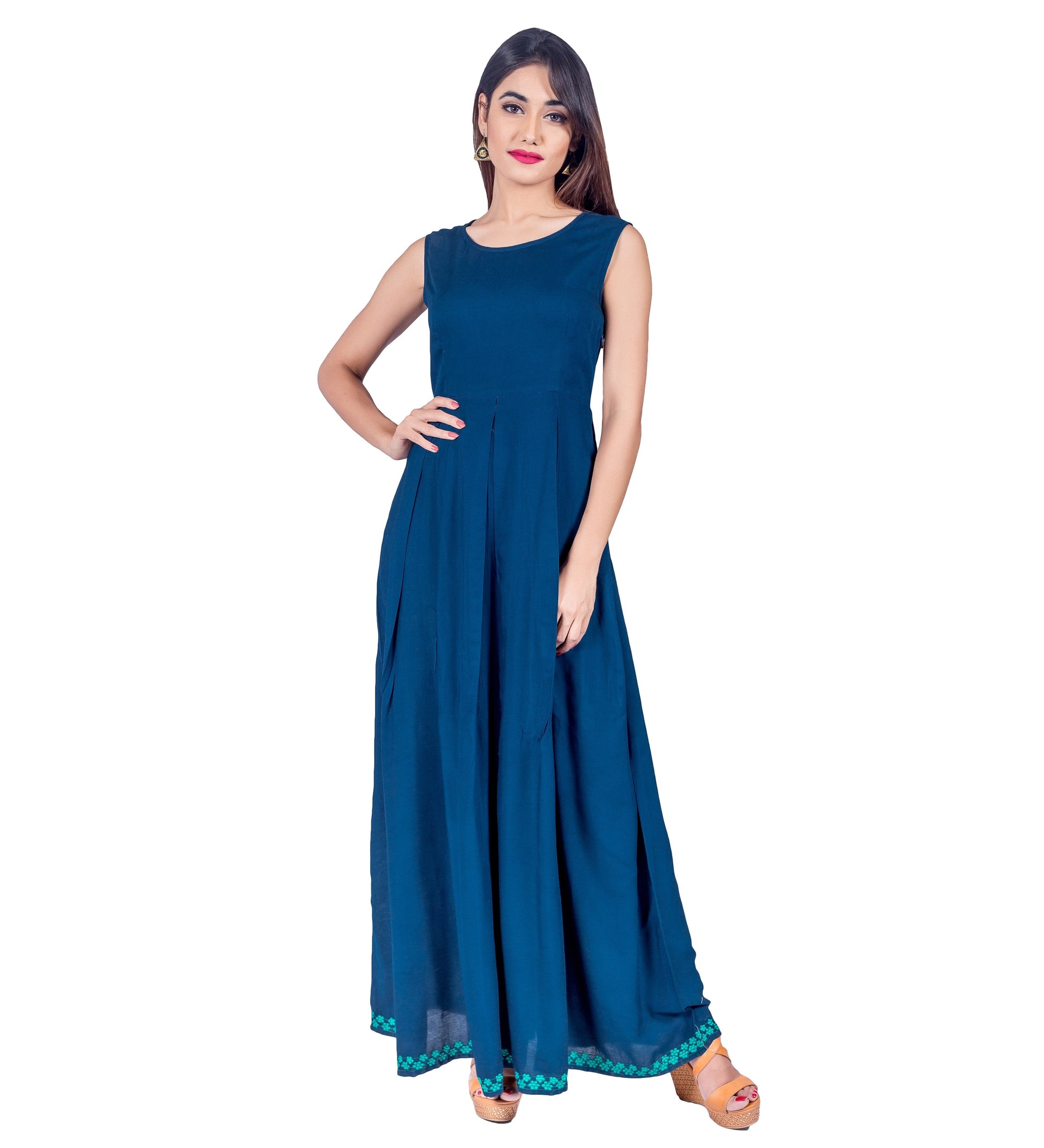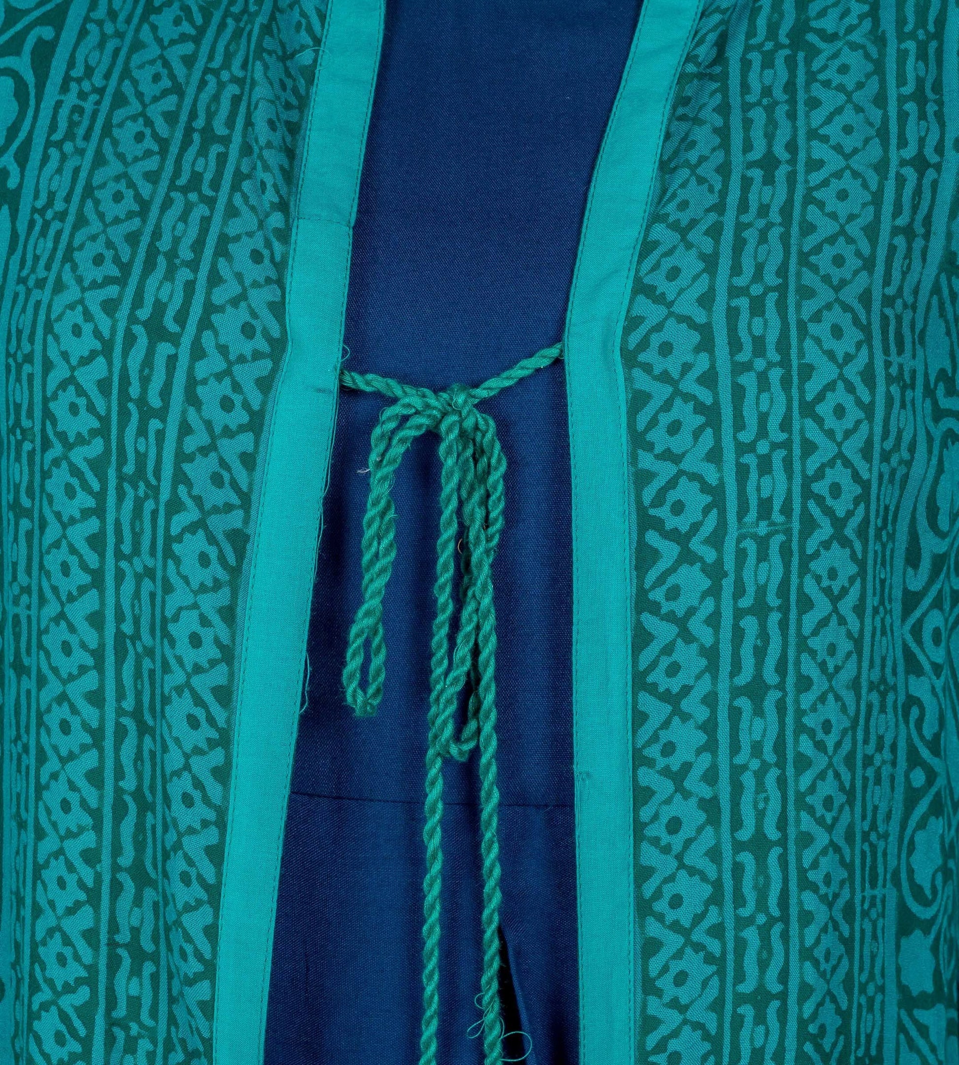 Teal Blue Hand Block Printed Jacket Dress with Embroidery