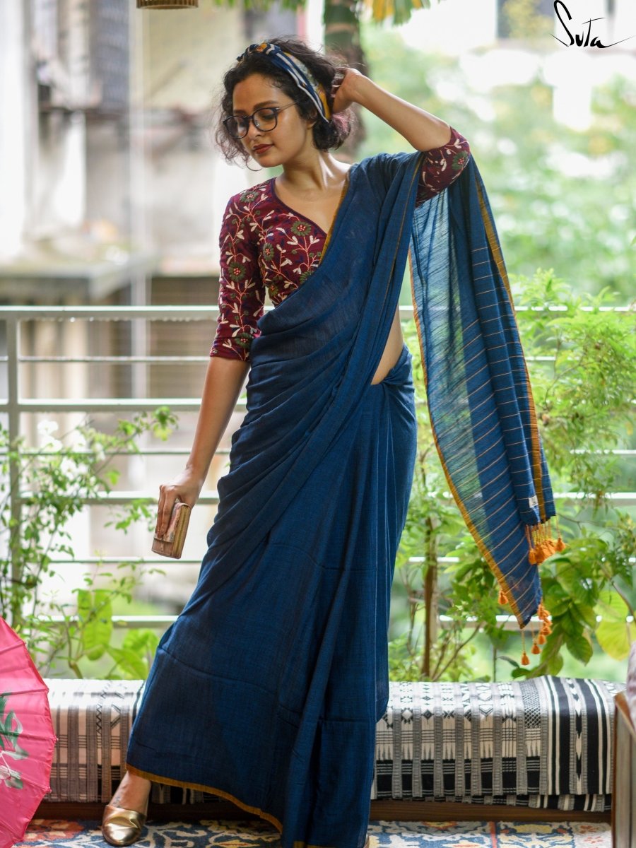 Simplicity and pristine beauty comes together in this blue saree in a blend of mul and viscose slub!