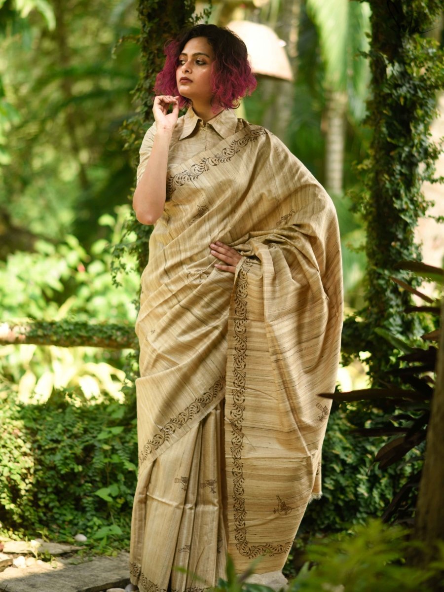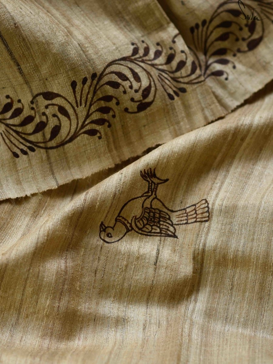 At Suta, our sarees become the canvases to bring this beautiful art-form to your wardrobes. The painting is done on Tussar silk.