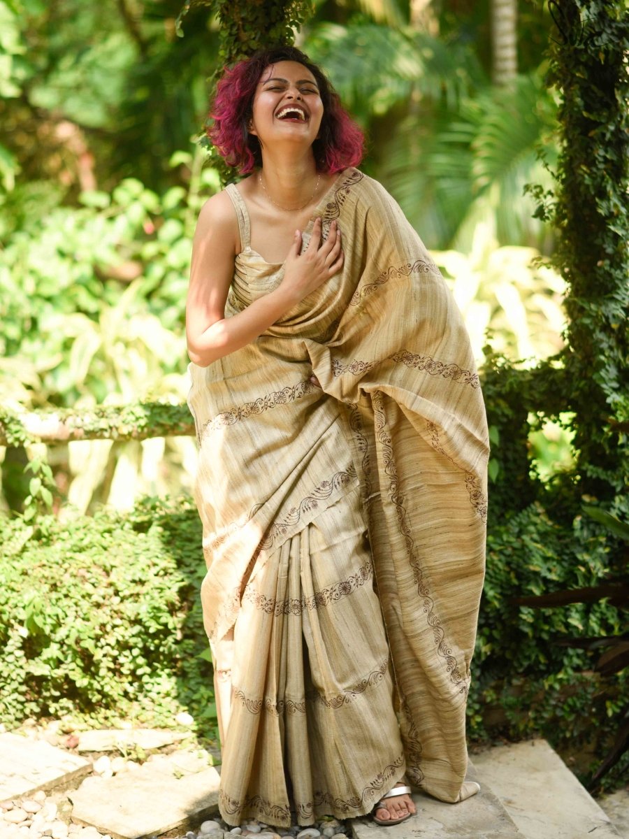 This beige and maroon stunner in Tussar with Pattachitra is a beauty!