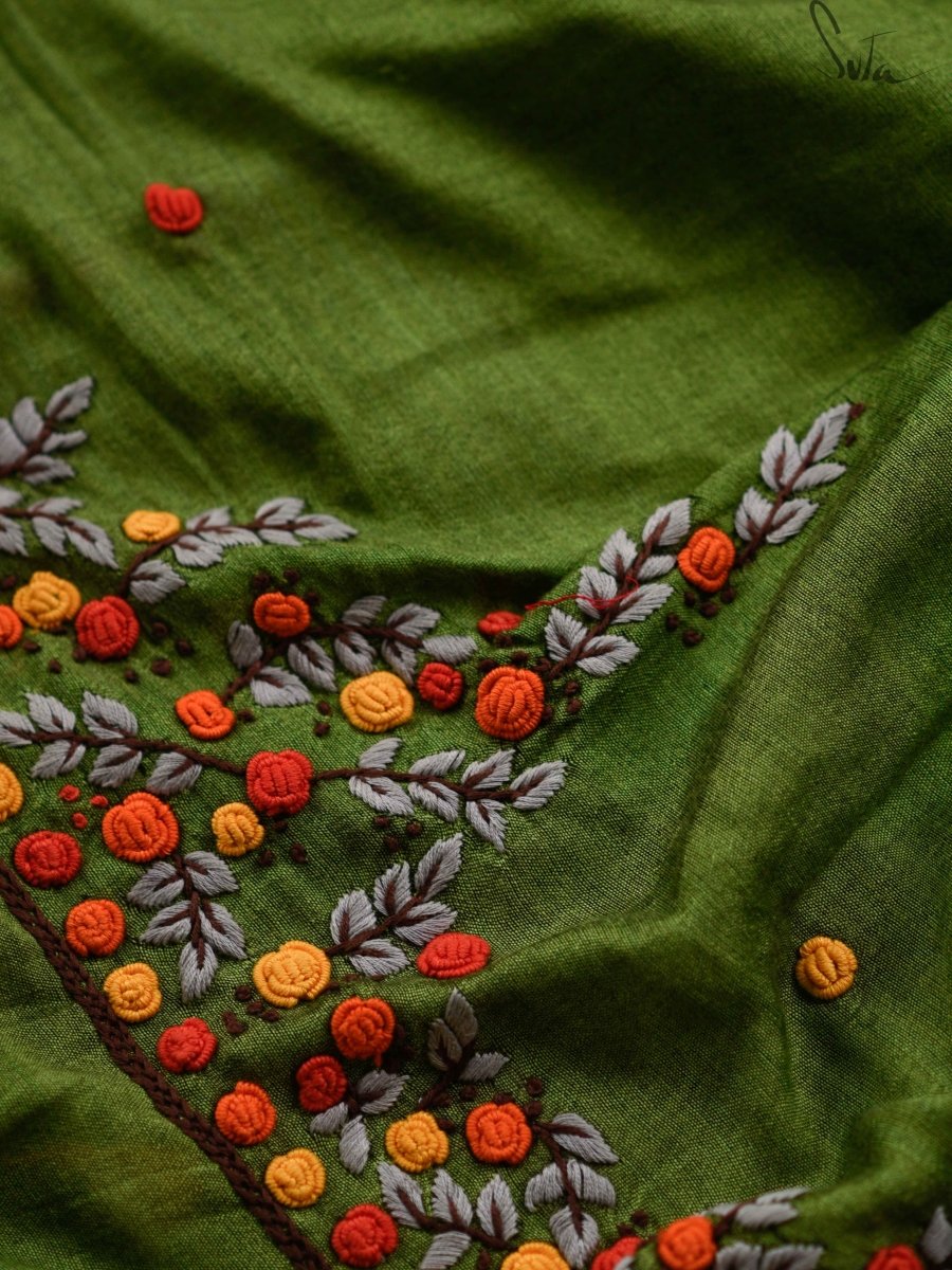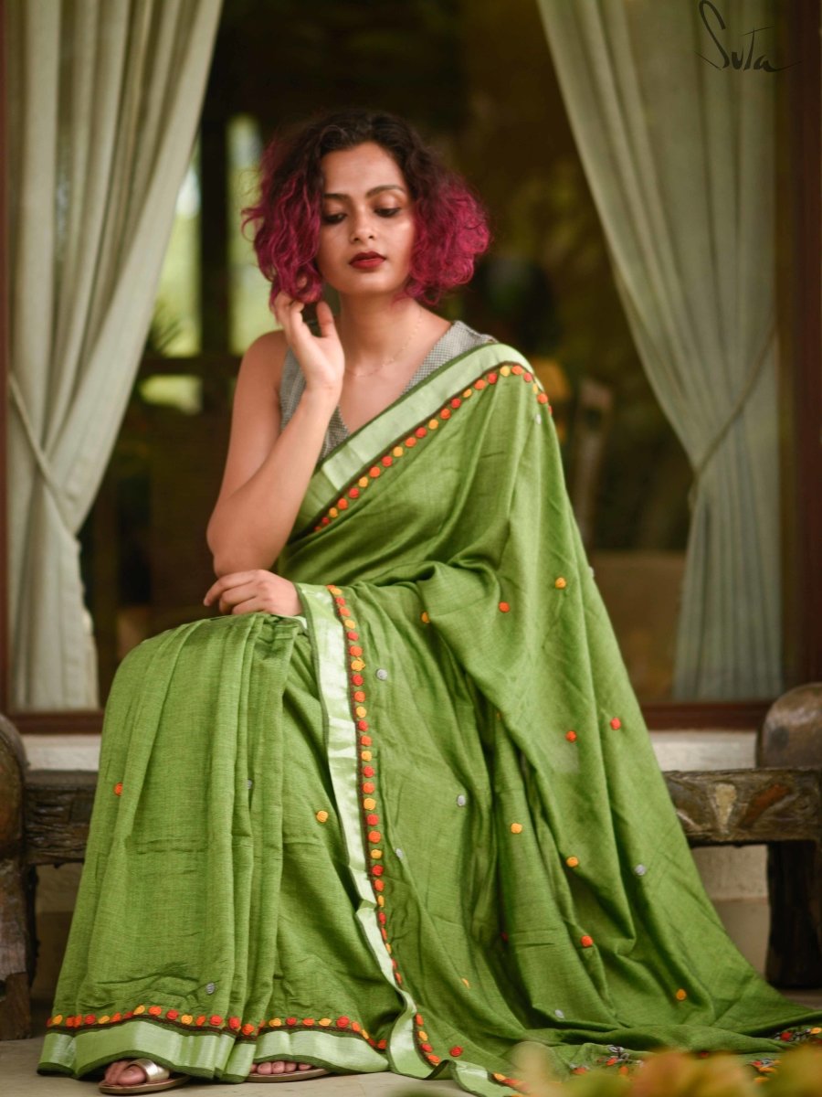 This beautiful saree in green, orange, yellow and silver hues is a blend of made in heaven mul and modal fabric and has gorgeous embroidery on it!