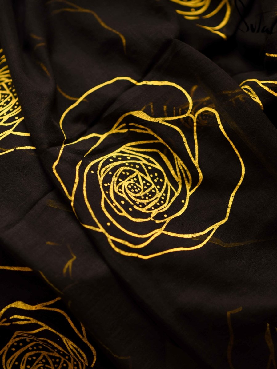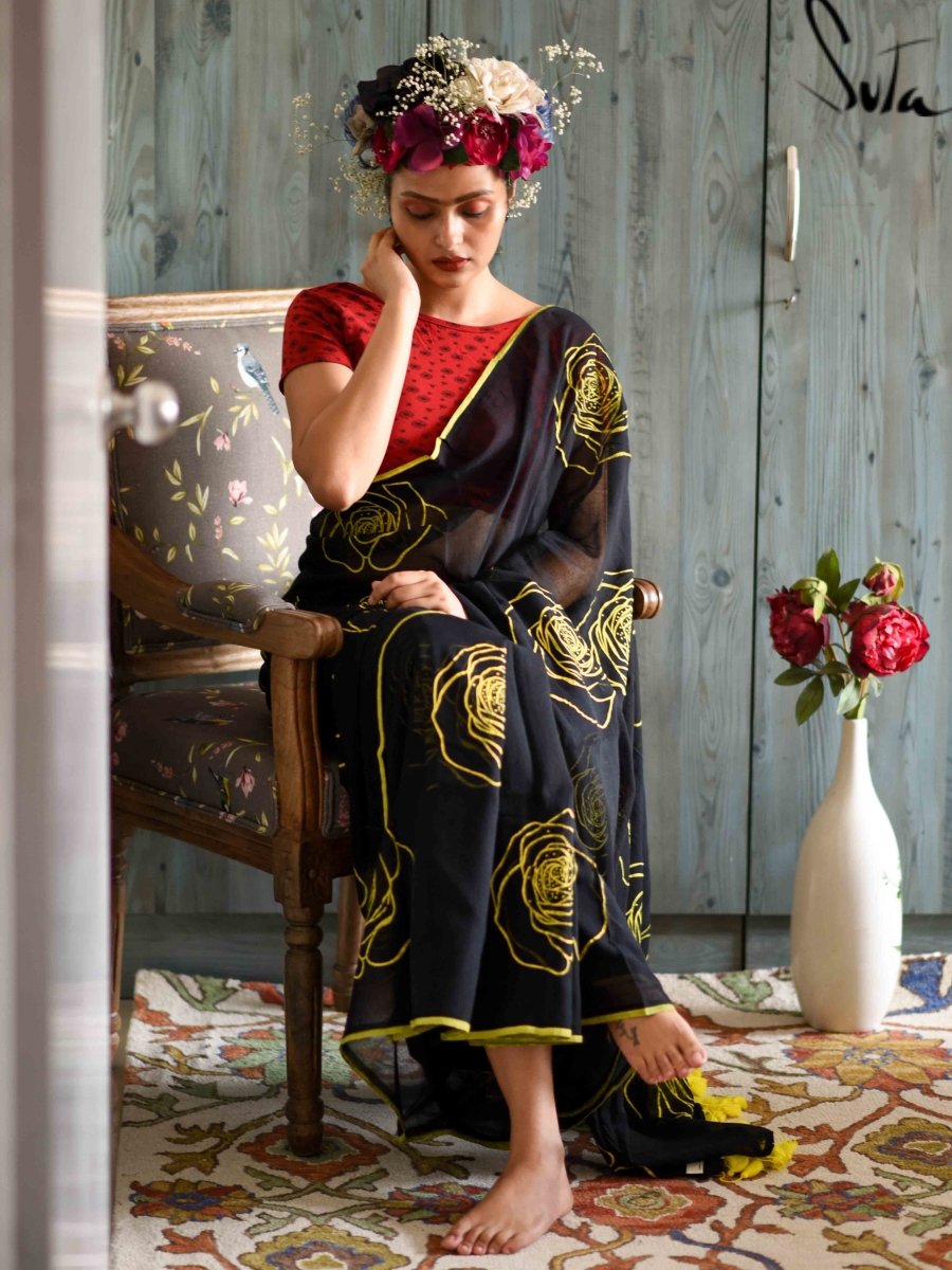 This black made-in-heaven mul saree with screen printed design is gorgeousness all over!