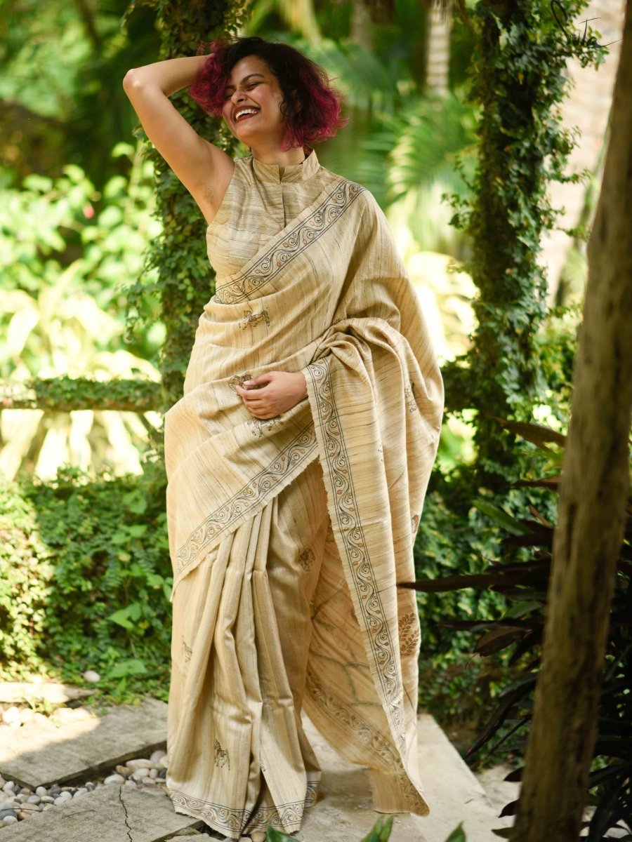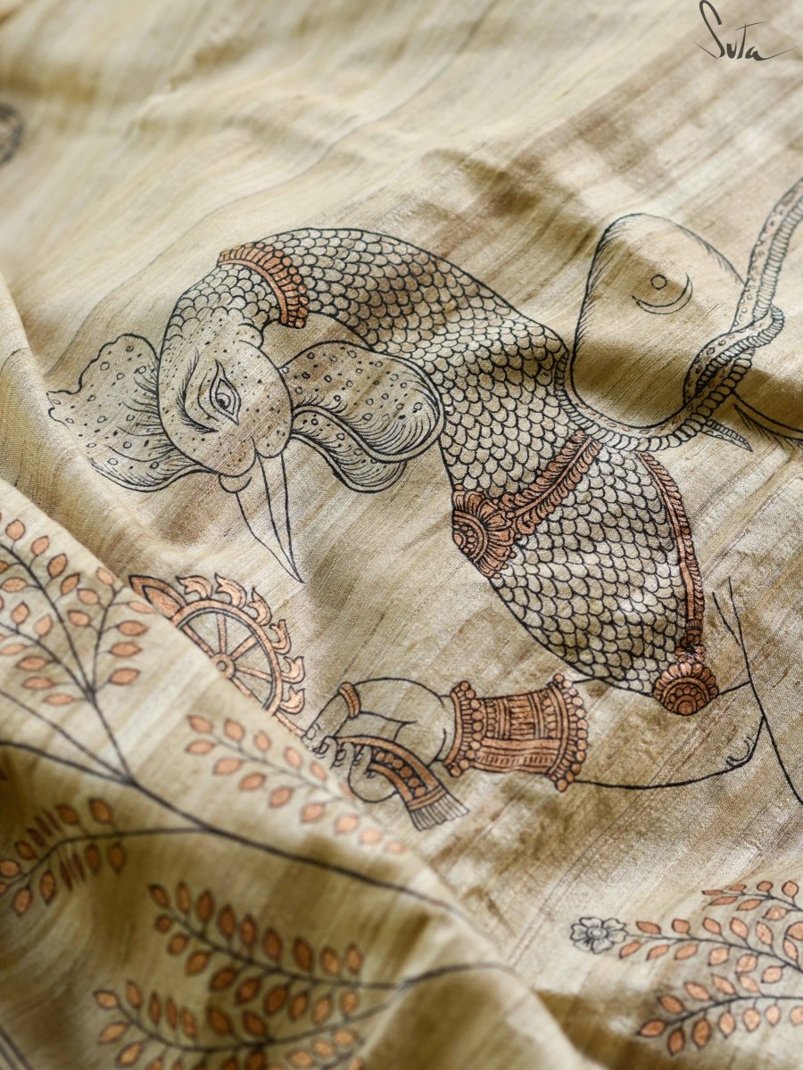 At Suta, our sarees become the canvases to bring this beautiful art-form to your wardrobes. The painting is done on Tussar silk.