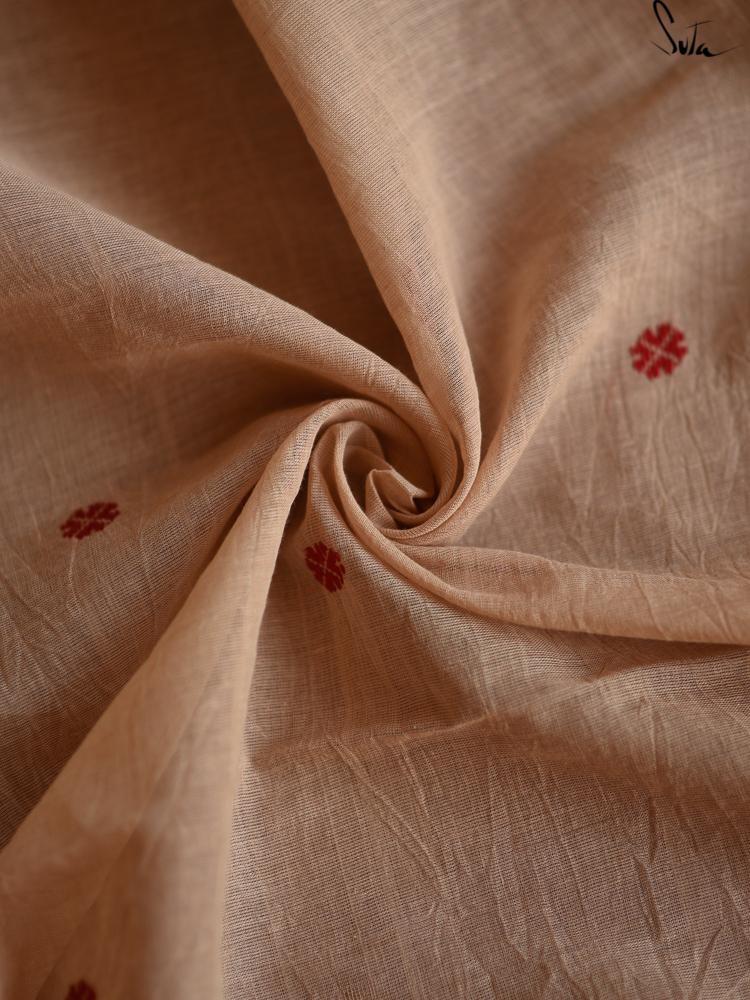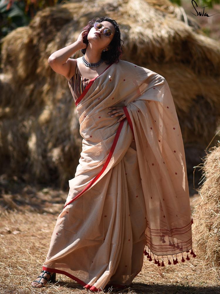 This beige and red handloom cotton saree is earthy, beautiful and elegant.