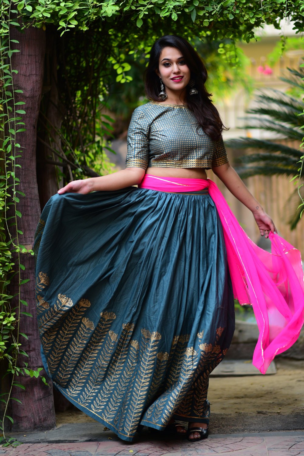Turquoise Blue Floral Lehenga Set with Dupatta (Set of 3)