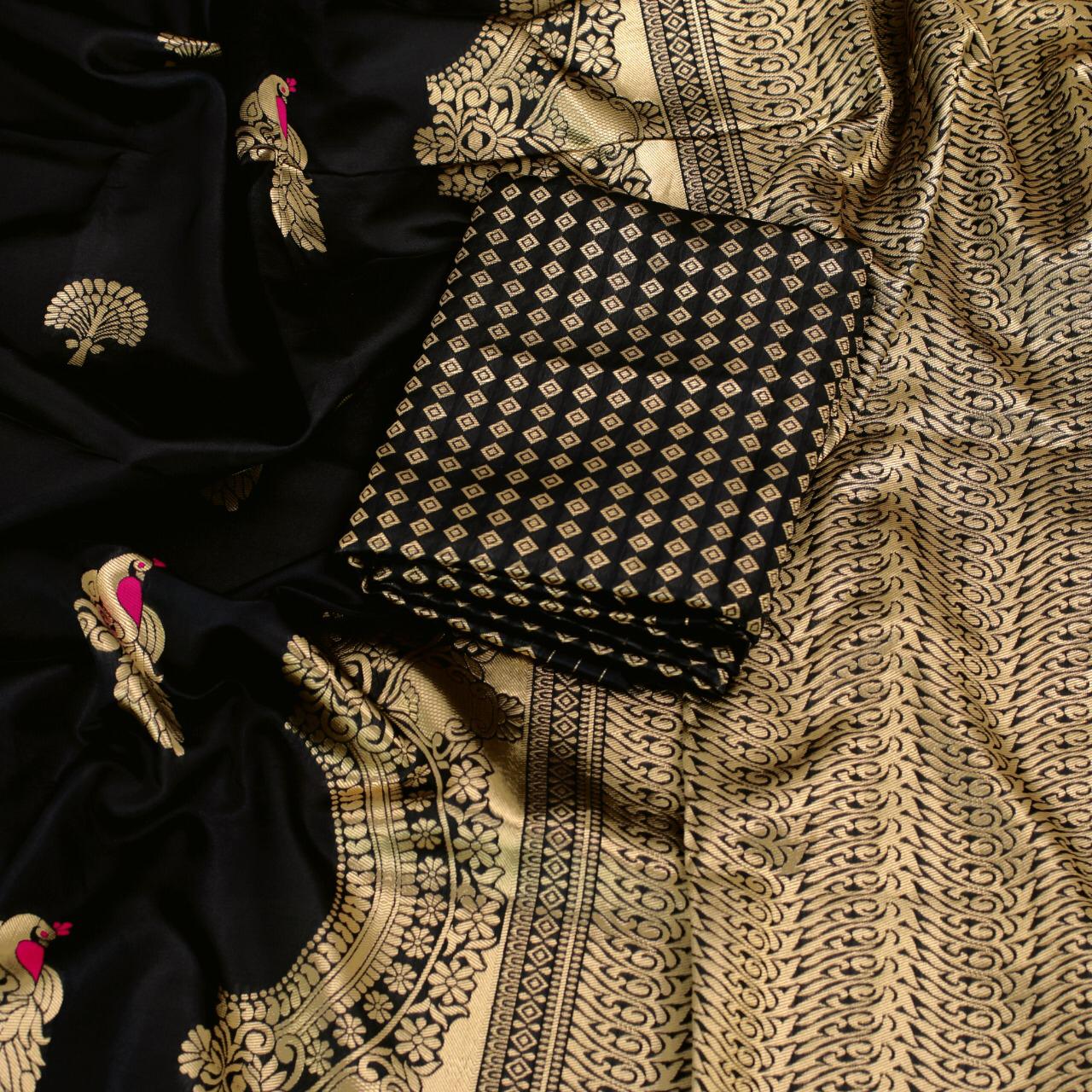 Paired with a matching unstitched blouse piece with similar weaved floral Silk.