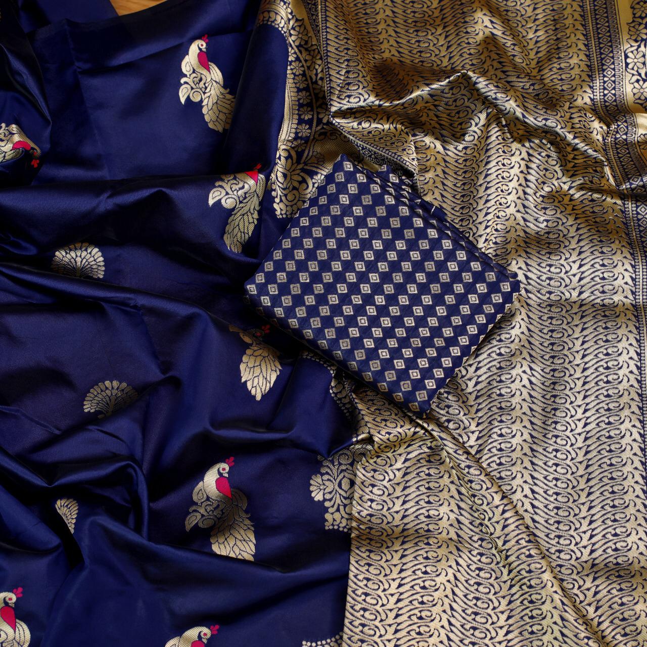 Paired with a matching unstitched blouse piece with similar weaved floral Silk.