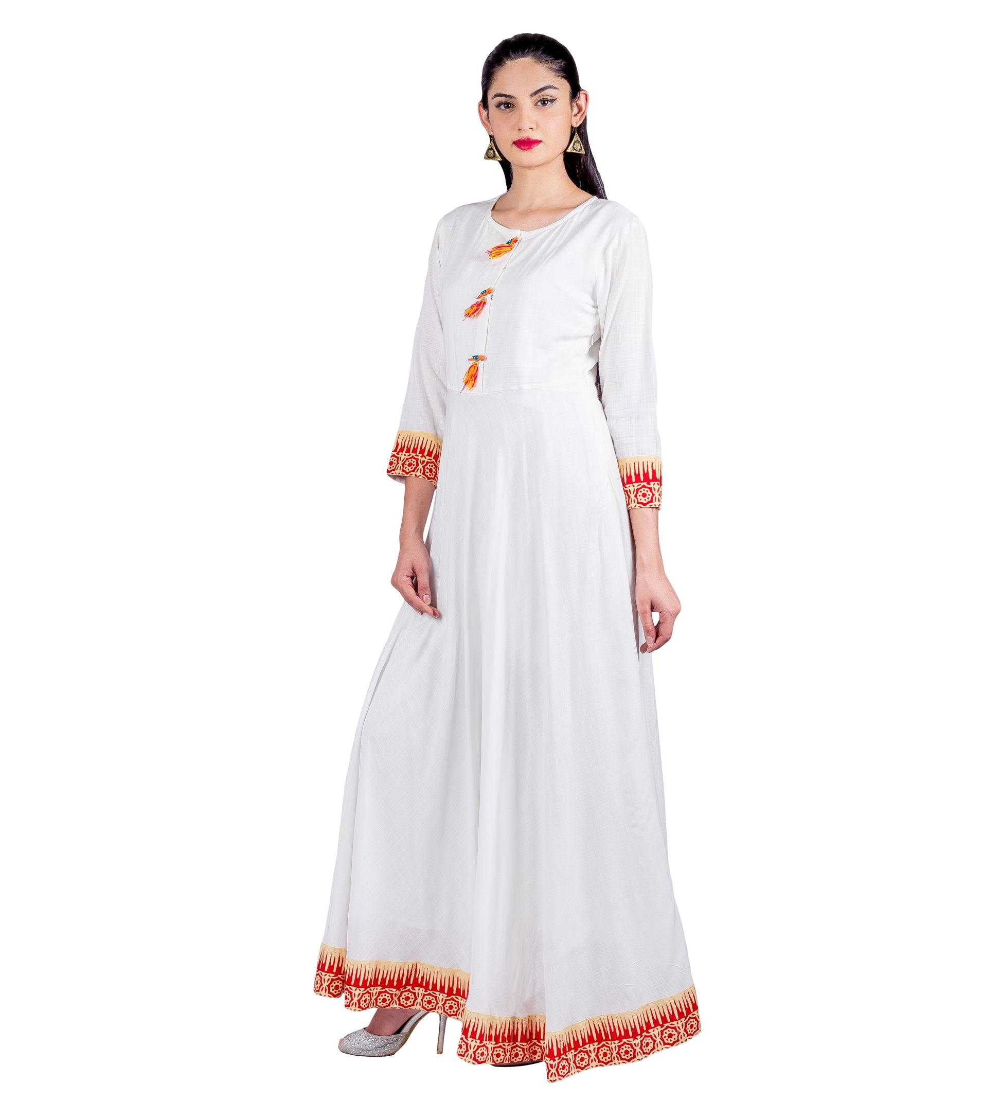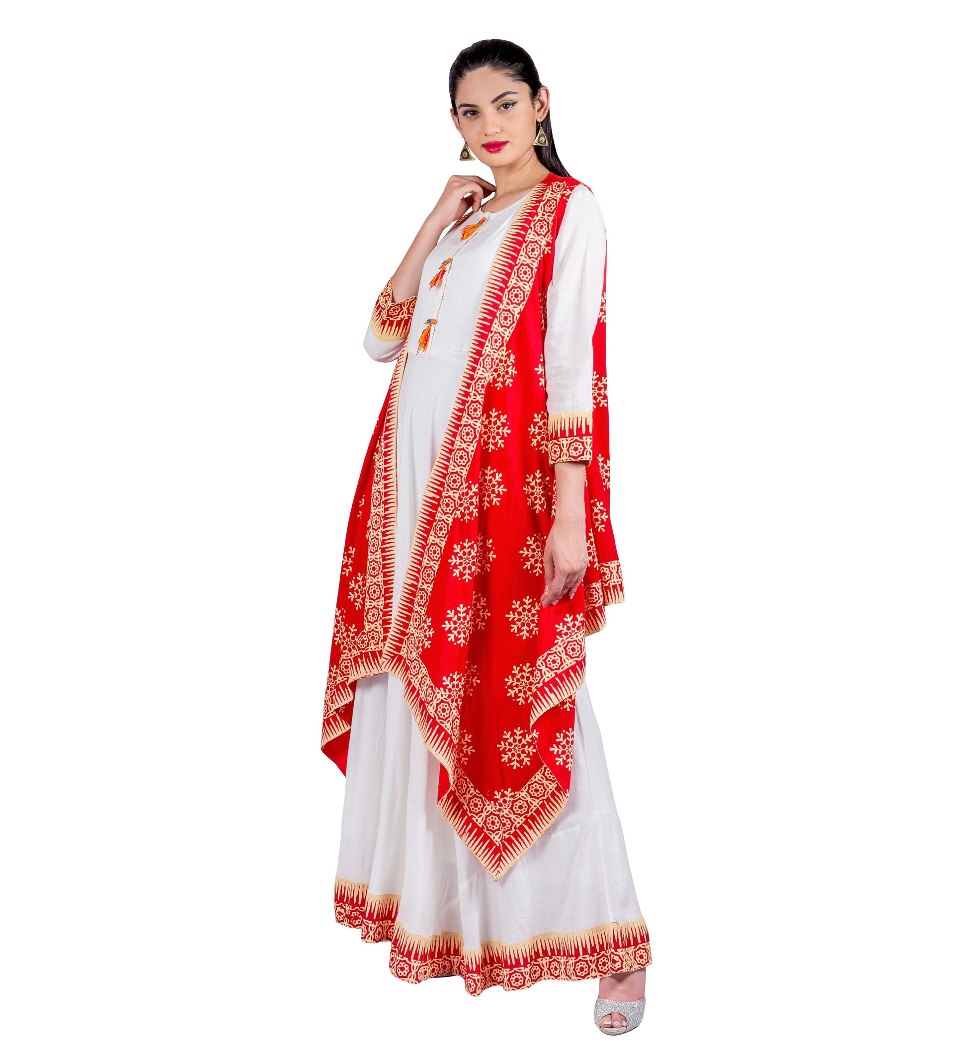Vermilion and white can create magic to make you simply stand out especially with a colorful waterfall shrug. Choose this flamboyant cotton/rayon slub maxi dress cum to add witty flamboyance to your Indo western dress closet. Welcome impeccable cool and fascinating style aided by the perfect sync in the vermilion hem and dress cuffs. Imbue in your dress collection this mixed white/vermillion stance to put you on a high fashion pedestal. Glitter, shine, and sparkle trending in this high-spirited style from iconic collections.