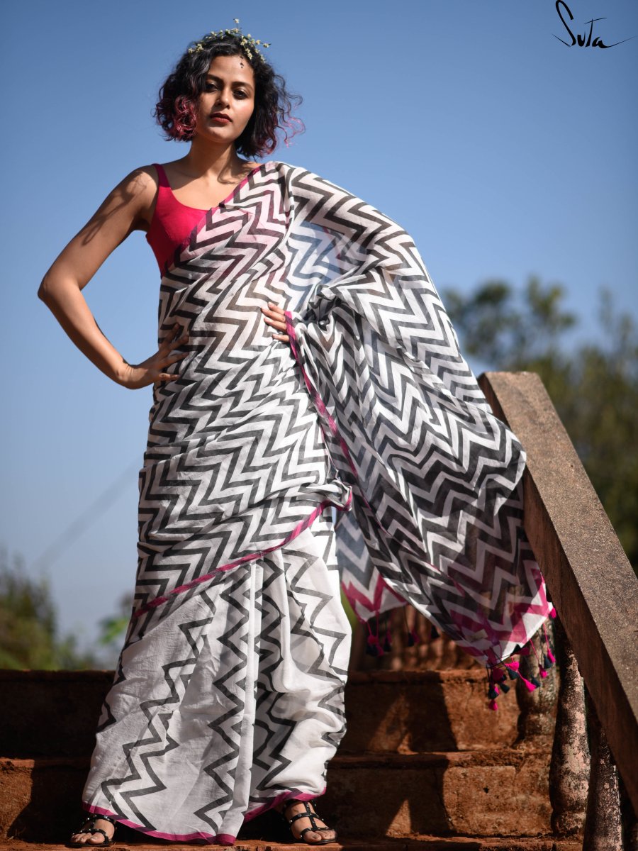 This white made in heaven mul saree with pink and grey details is a fun, beautiful drape!