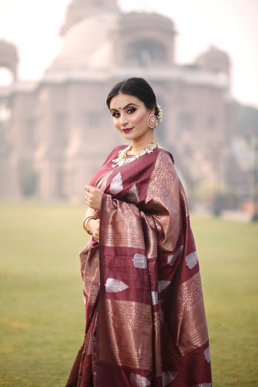 Paired with a matching unstitched blouse piece with similar weaved floral Silk.