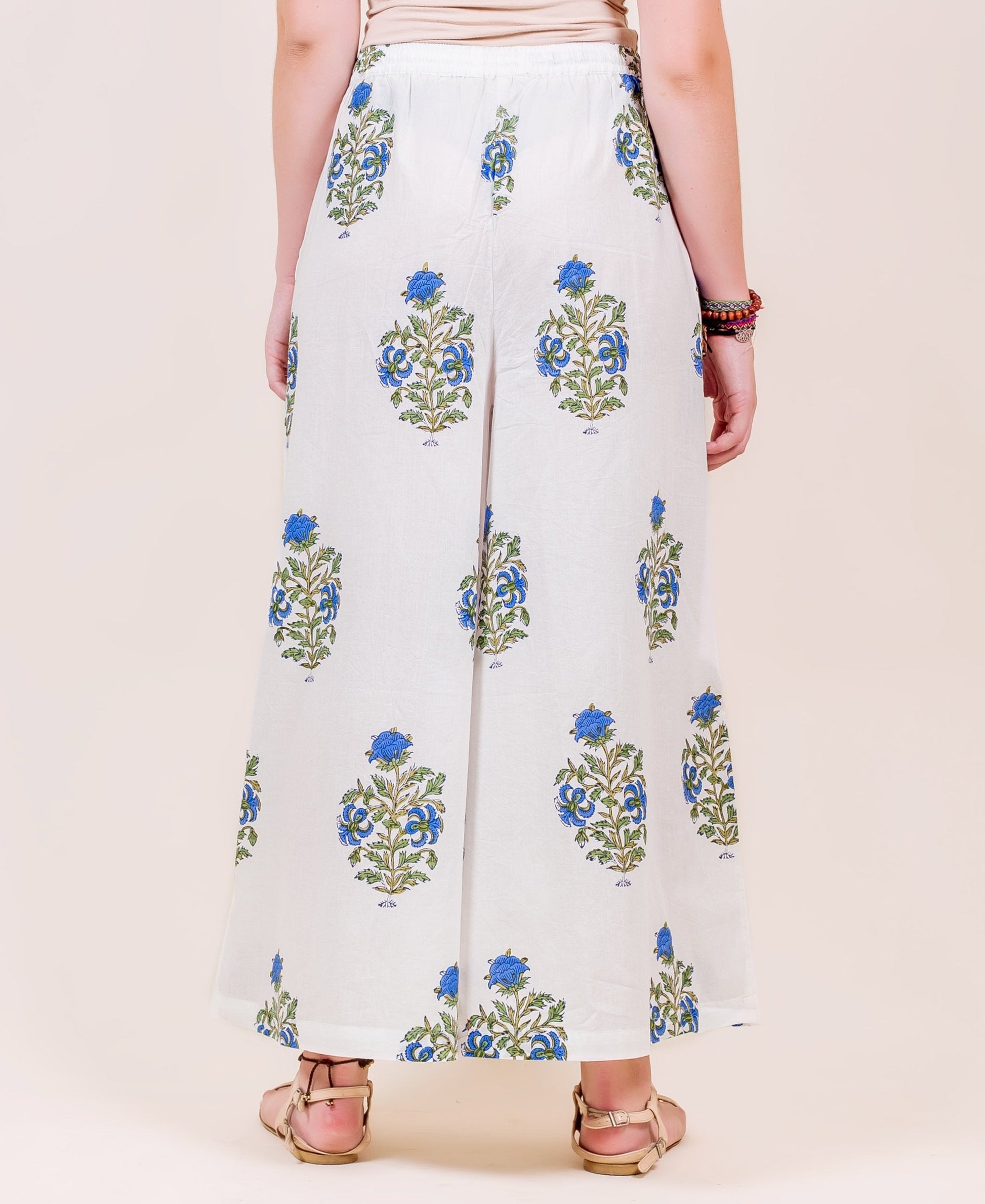 - White and Blue Hand Block Printed Wide Leg Palazzo