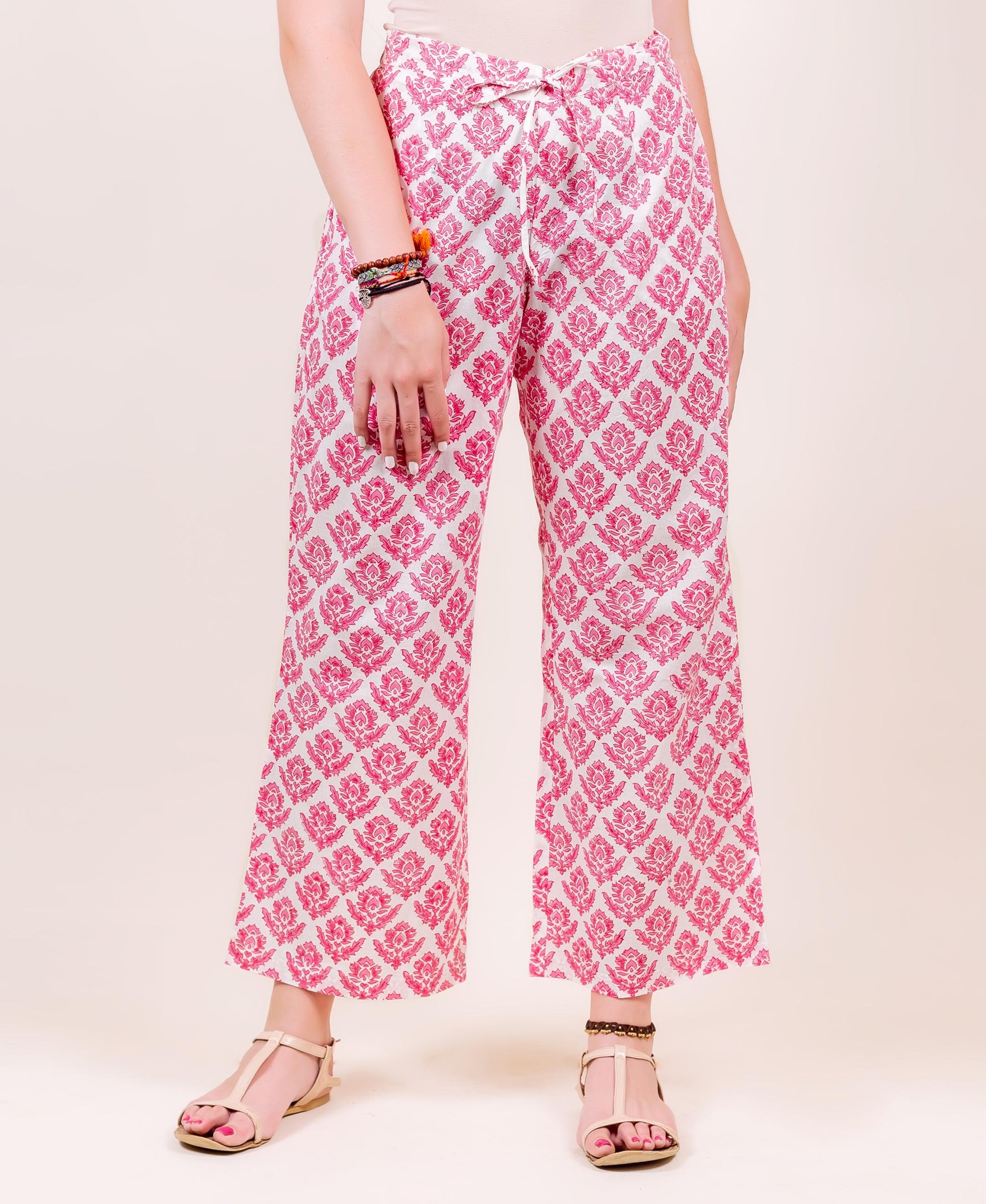 - White and Pink Hand Block Printed Palazzo
