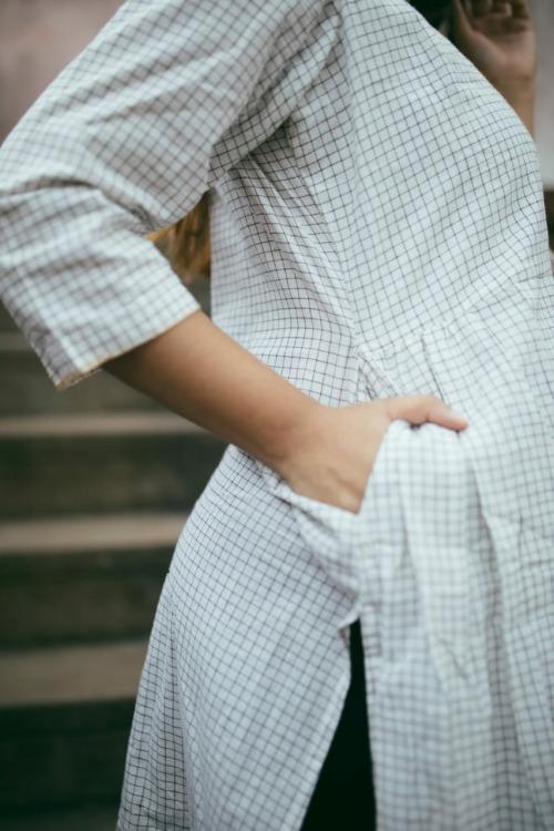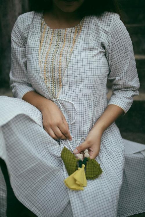 this kurta in pleasing checked white colour fabric has two layers for the front and has traditional embroidery on the yoke in subtle colours. it also has beautiful tassles in matching colours made of upcycled fabric.