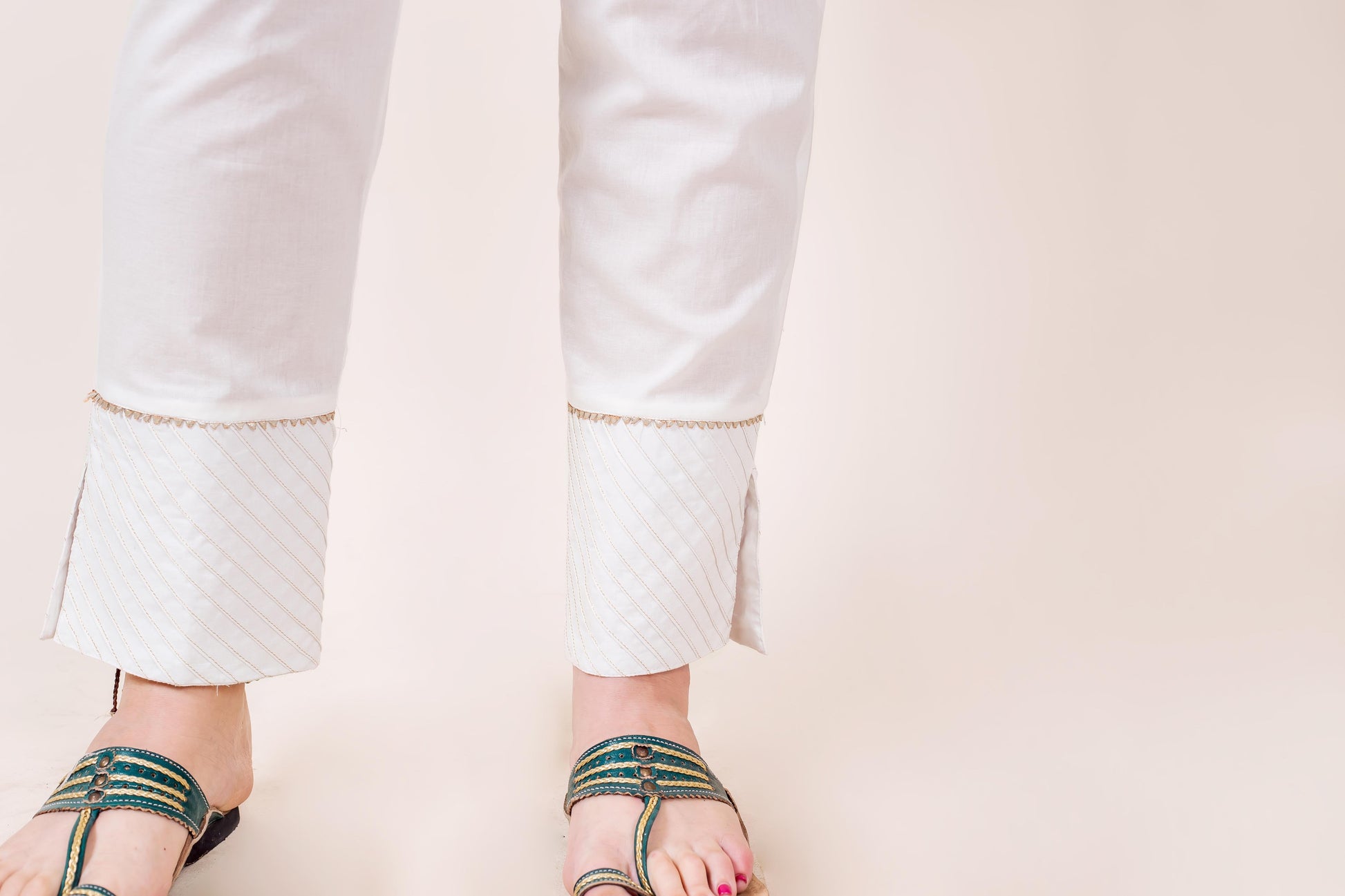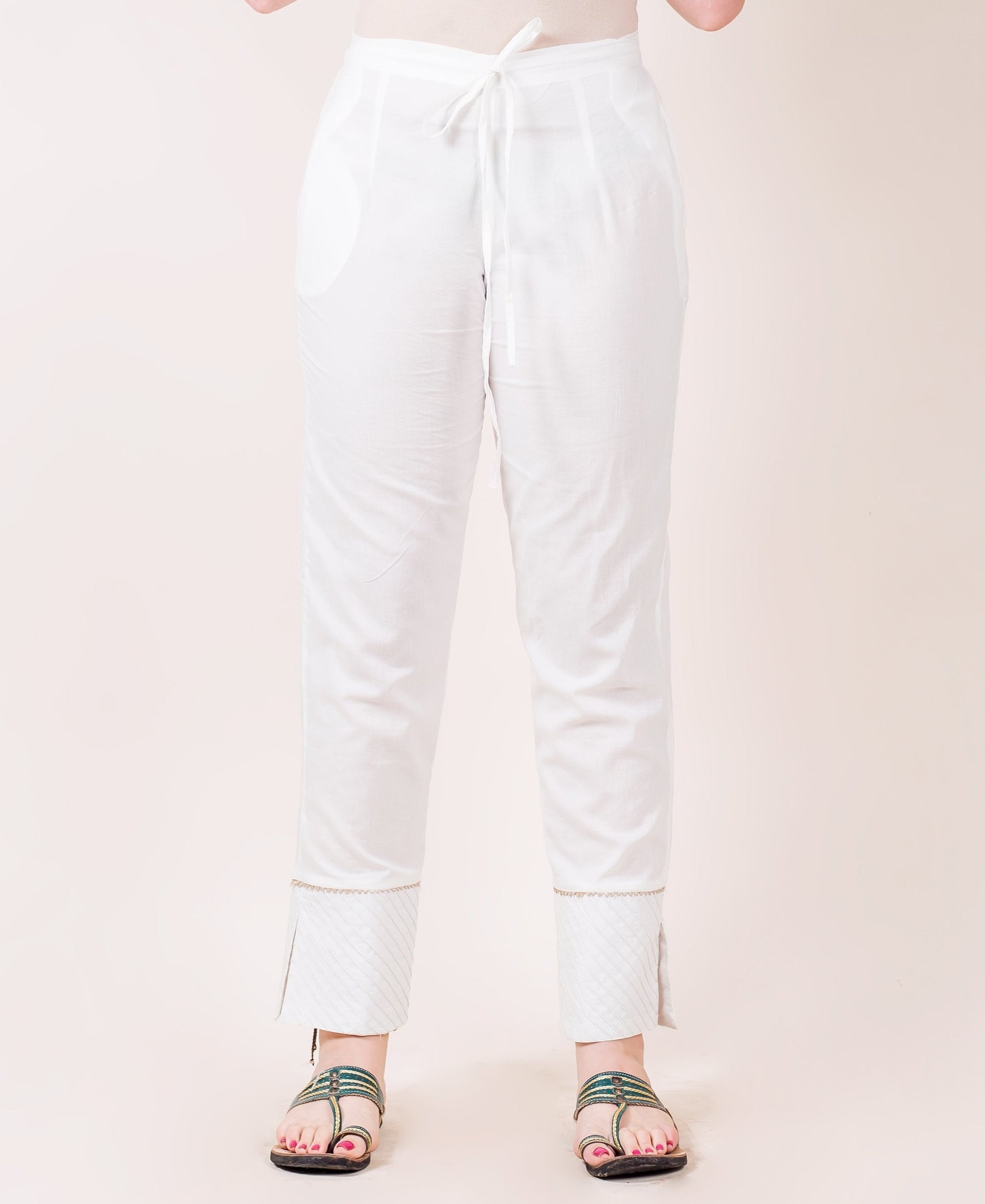 White Solid Straight Pants with Gota Trim and Kingri Lace