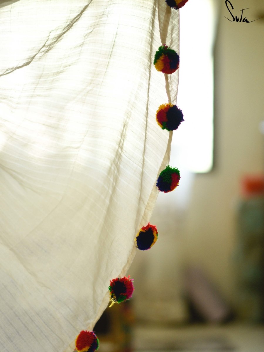We skip our beats when we hold this darling. It sure looks like a fabric made in heaven. Its woven with care which is in-comprehensible. Both with silk and cotton threads that is delicately woven together and red tassel balls hanging in the pallu, this beyond doubt is our best products of SUTA. We see keep this saree as a reminder of what we started suta for- eternal love, raw threads, traditional boldness and uninterrupted simplicity.