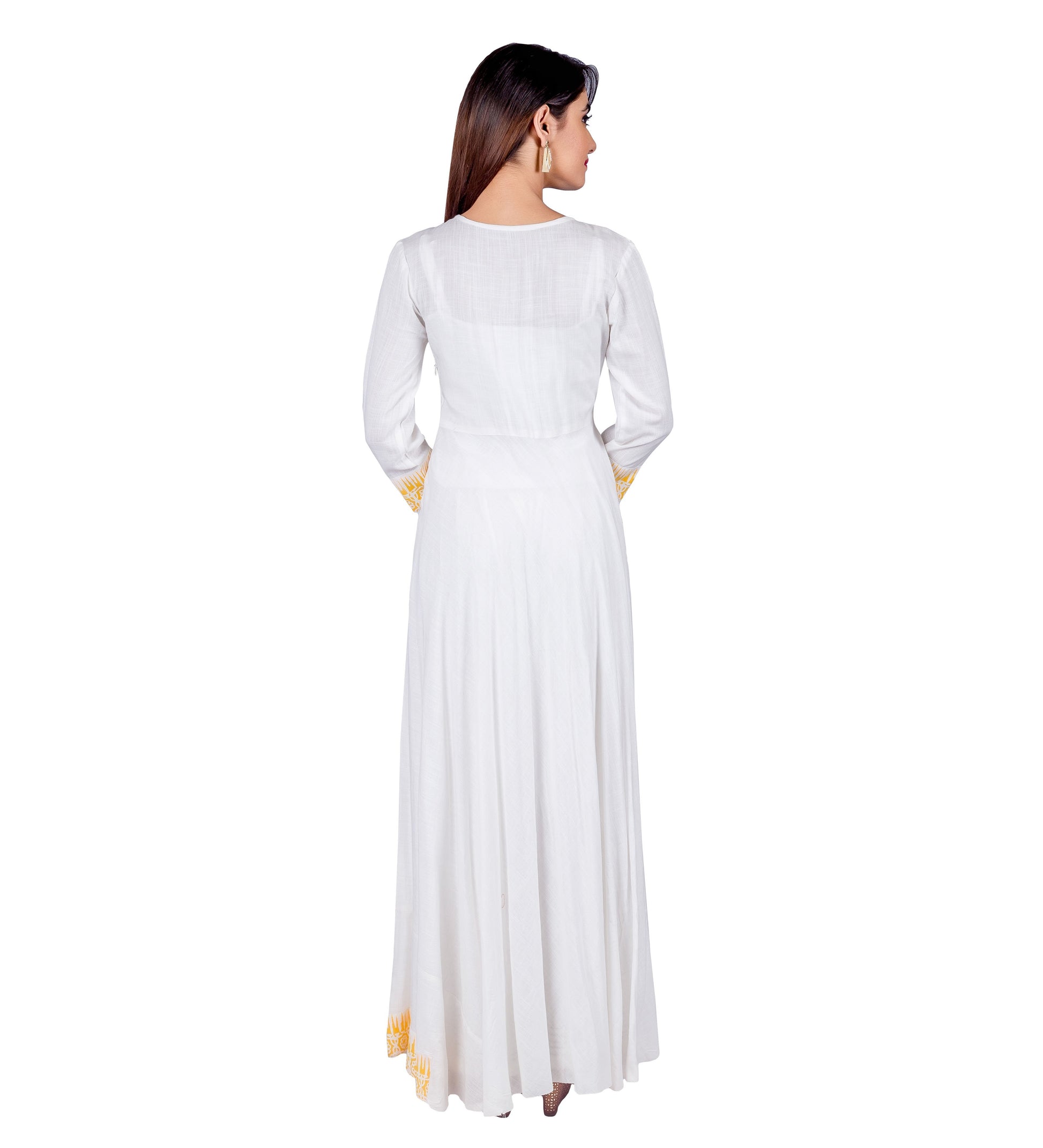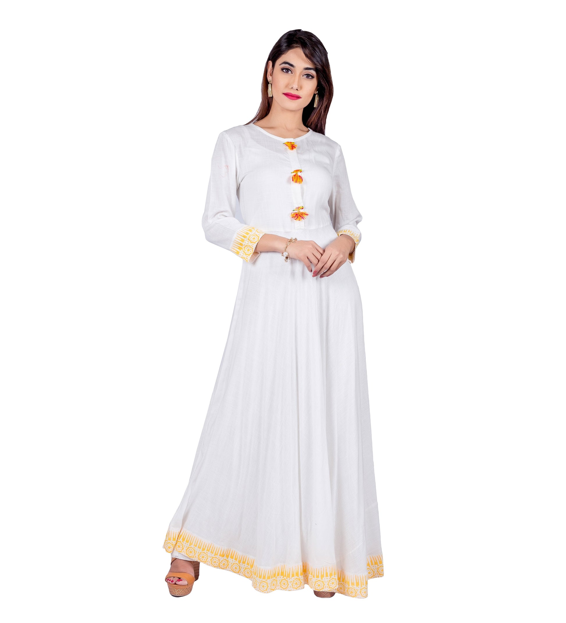White / Yellow Indo Western Maxi Dress with Front Tassels