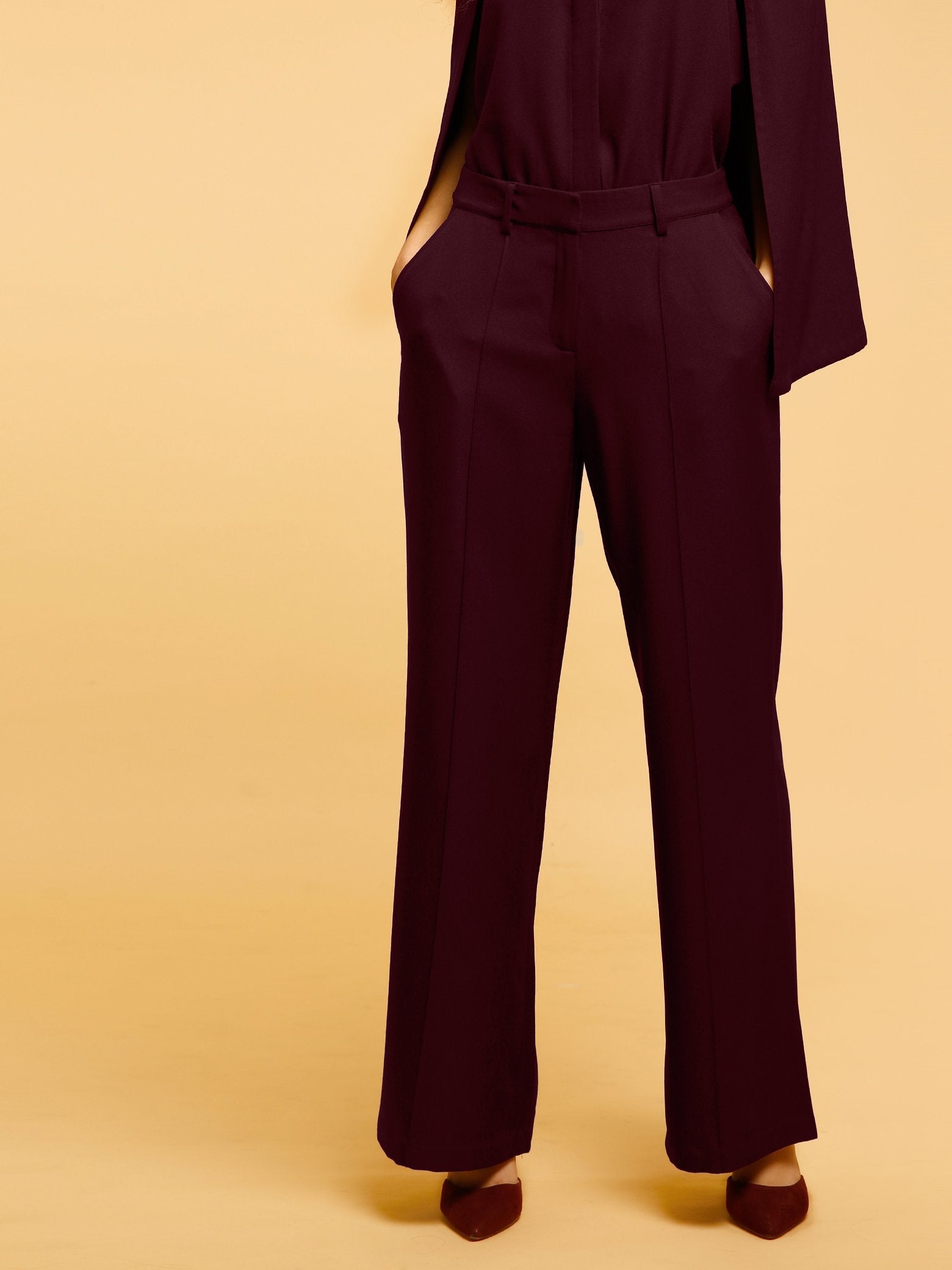 Opt for desk to dinner chic with these maroon, wide-legged pants. They have delicate creases, hook and zip for closure, loops for belt and functional pockets. Made from Poly Moss,they are slightly textured, immensely soft, stretchable, anti-wrinkle and anti-pill.