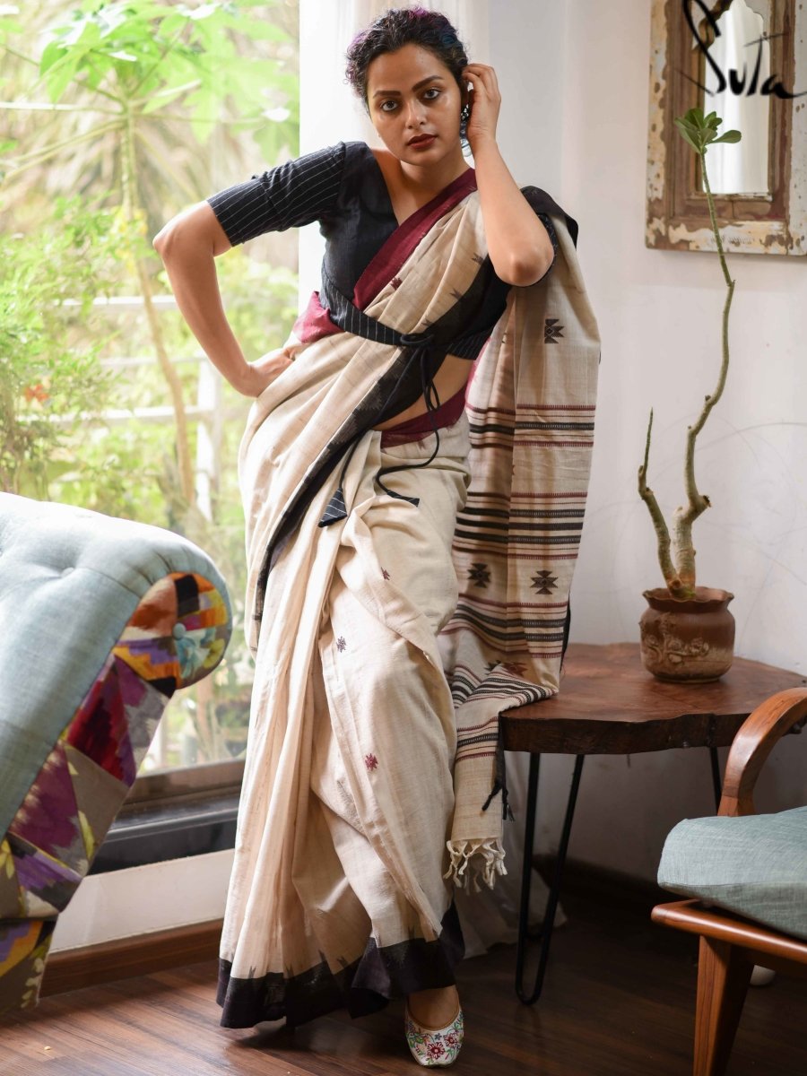 This gorgeous off-white Kotpad cotton silk saree is named after the yarns for Kotpad weaving that are spun, treated, dyed and prepared for weaving right in the yards of artisans. These Yards and Yarns carry that essence of home within that feels beautiful!