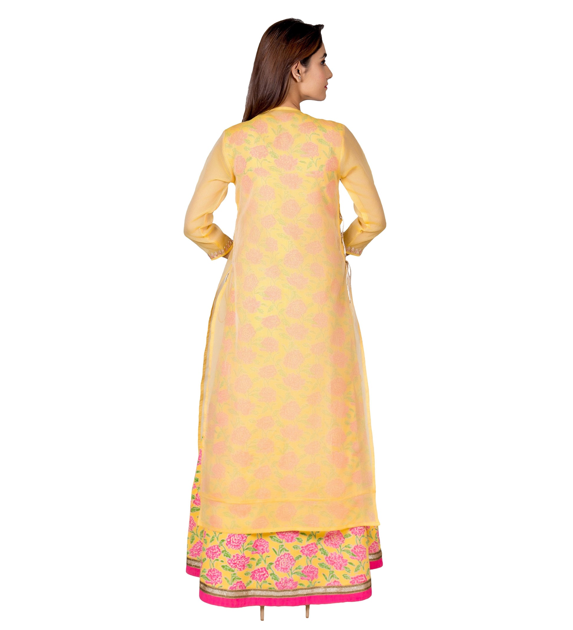 Widen up your fashion contour with this yellow and pink hand blocked printed embroidered indo western dress with chanderi jacket. This graceful indo western kurta dress is a must have for all your elegant evening parties or card games binges. This luxurious chanderi kurta is accompanied with block printed cotton inner with stylized embossing from the latest designer indian fashion house of . This chic signature gotta embroidery is a classical combo for your fusion Indian wardrobe. It also has a lace and solid trim on hem. This outfit adds a all new feminine side with the side open kurta with strings and tassels.