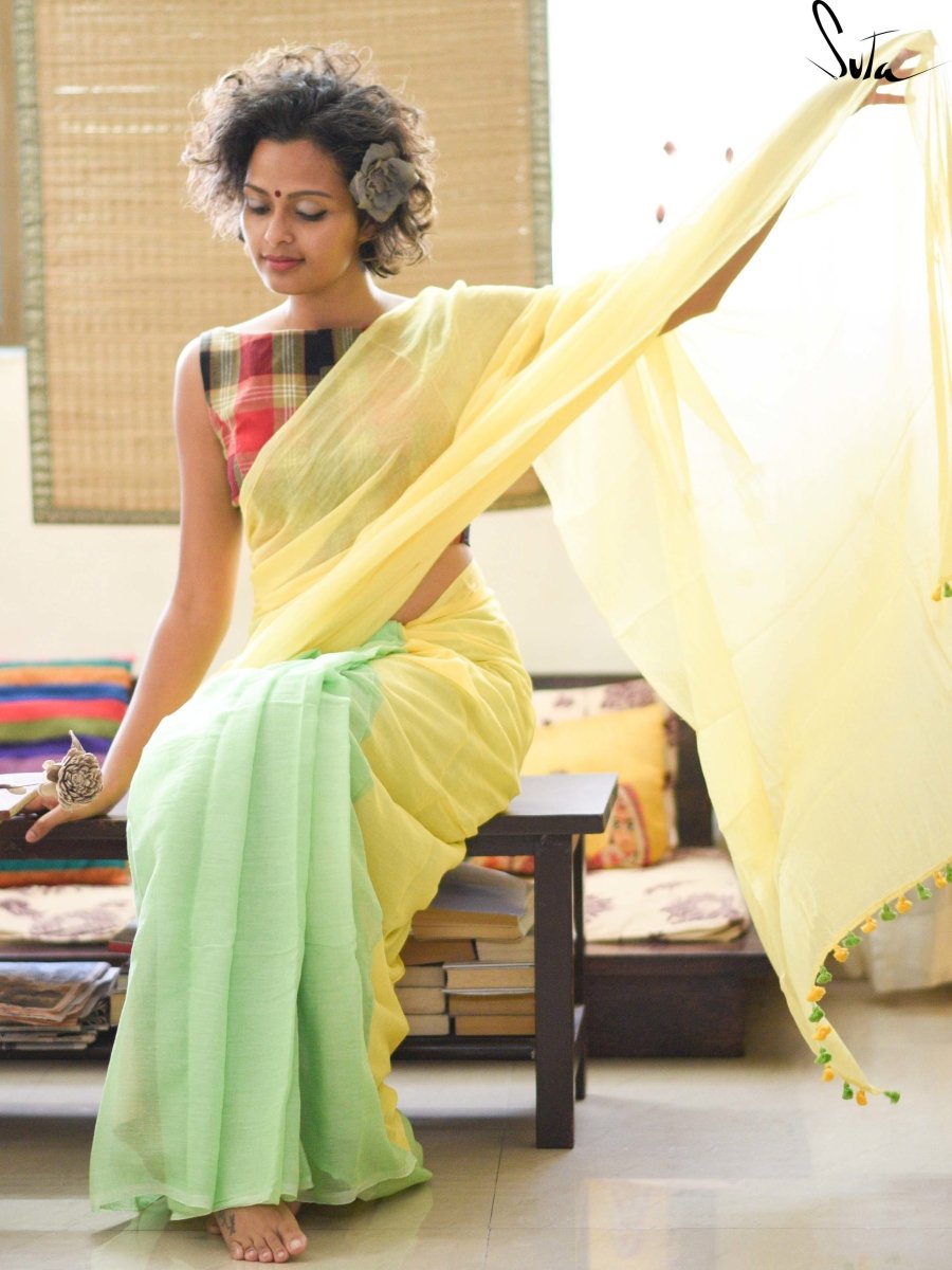 This parcel of love in pastel shades. Once draped wont let your heart leave this saree. A perfect office wear to stay sexy yet summery. A must must have! These don?t come with a blouse piece- so girls team it up with a checkered or kalamkari or any busy prints blouse.
