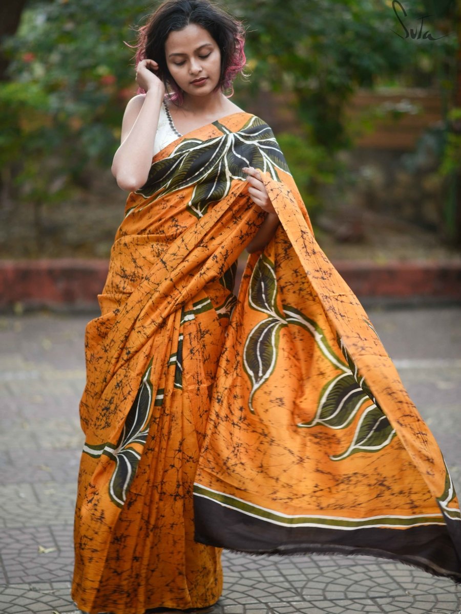 The ancient craft of wax-resist dyeing called Batik adds a timeless charm to this saree. Wax-resist dyeing has been a part of so many ancient civilisations across the world and can be uniquely characterised by the local motifs and designs used. Specifically in India, Batik is said to have over 2000 years of history. Materials such as wax or rice starch was used to create the resistance to dye and thus create the Batik designs. The entire process involves various steps such as drawing the basic pattern, redrawing using wax and then applying the dye.Then, the wax is removed after the fabric dries. This is done multiple times to create various patterns with different colours.The process of dyeing is something that has been passed down by generations of artisans and the stunning designs created by these master craftsmen are timeless.