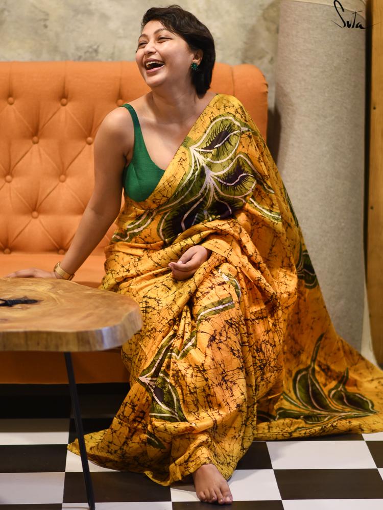 This hand done Batik Mulberry silk saree in yellow and green is just perfection !
